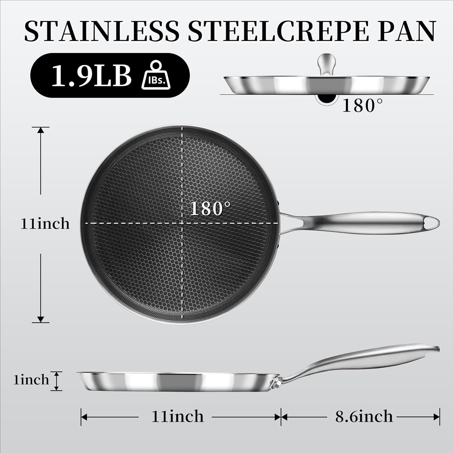 Nonstick Crepe Pan 11inch Stainless Steel Crepe Pan Honeycomb Coating Flat Skillet Tawa Dosa Tortilla Pan,Omelet Pan with All Stove Tops Available, Induction Compatible