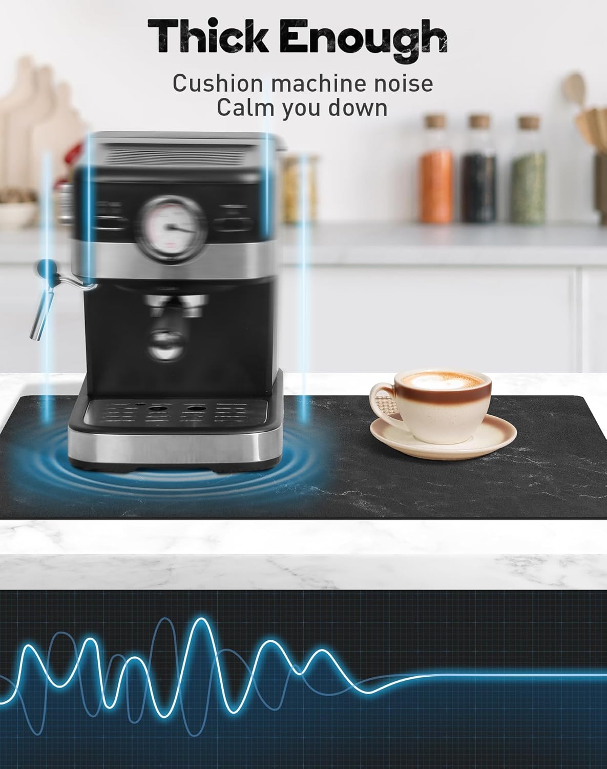 - Noise-dampening & Heat-resistant - Our coffee bar mat is 1/6" thick, which can effectively cushion coffee machine noise and reduce clinking sounds as cups touch the tabletop, ensuring you a tranquil and pleasant coffee experience. Additionally, it provides ample protection for your countertop, effectively shielding it from the heat of boiling water.