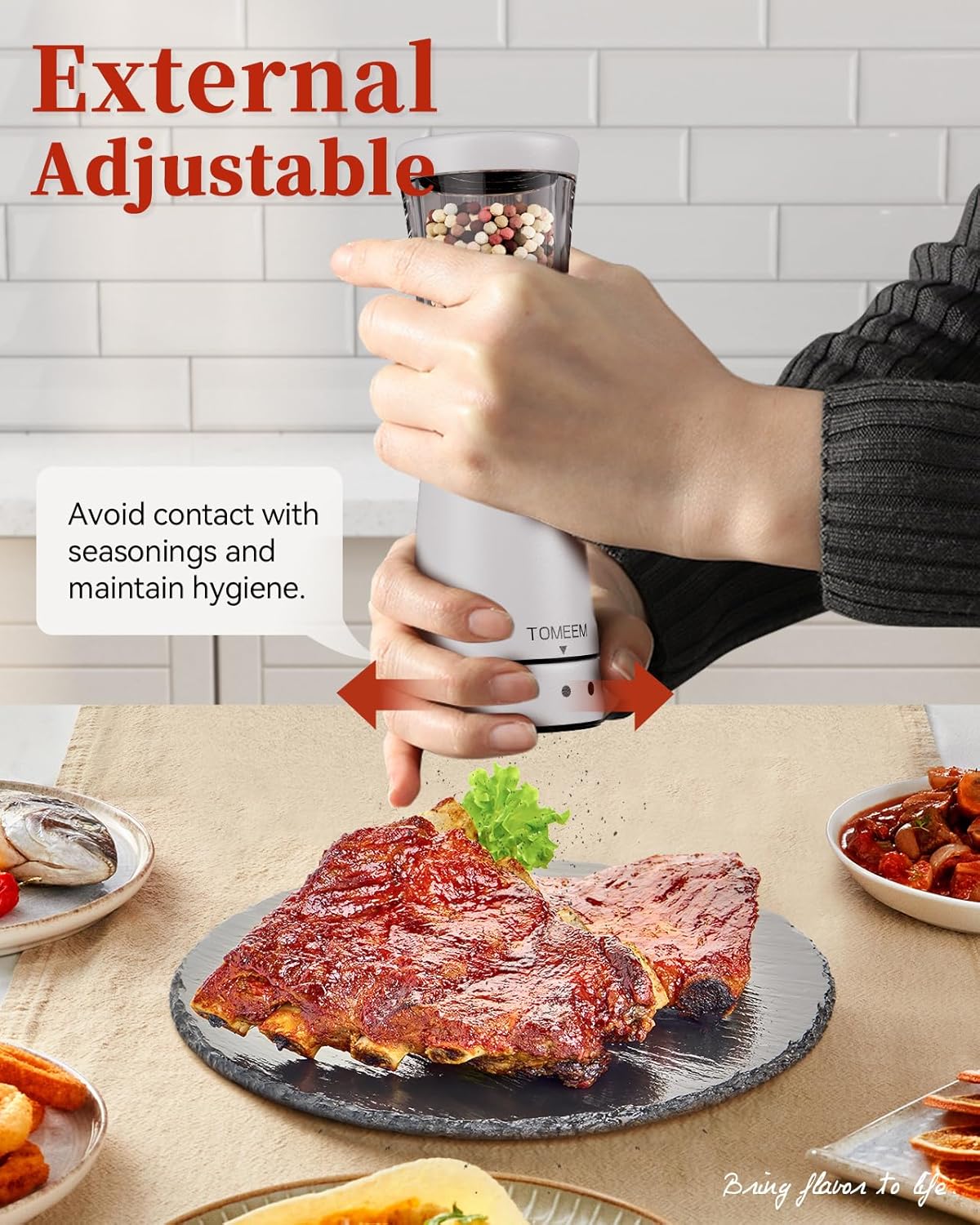 - Precision Grinding with Ease: Achieve the precise grind every time with the user-friendly adjustable coarseness feature. Simply twist the knob at the base to tailor your spices from fine to coarse