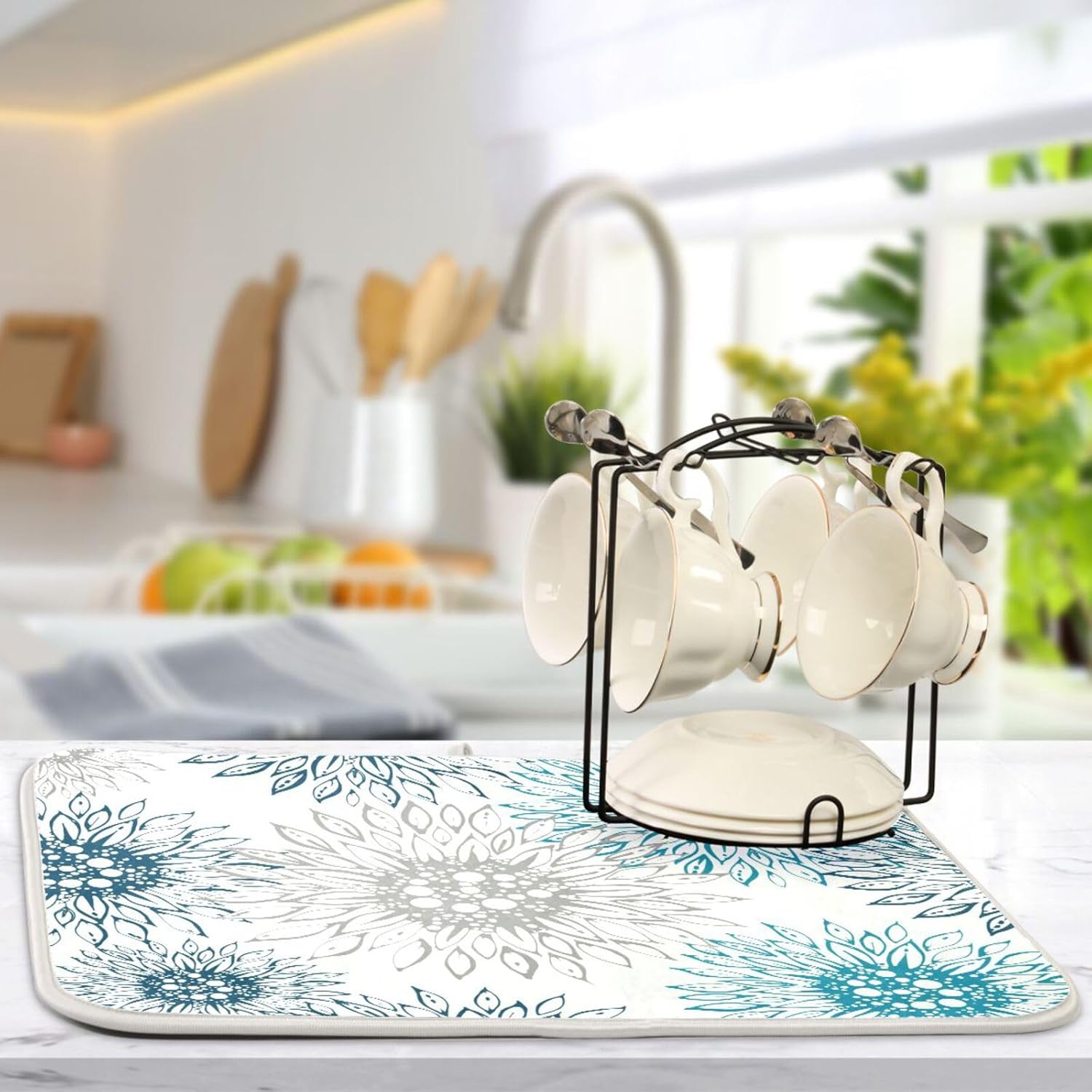 Abstract Flowers Sunflowers Dish Drying Mat for Kitchen Counter Absorbent Microfiber Drying Pad, Large 18x24 in, Blue White Reversible Drainer Mats