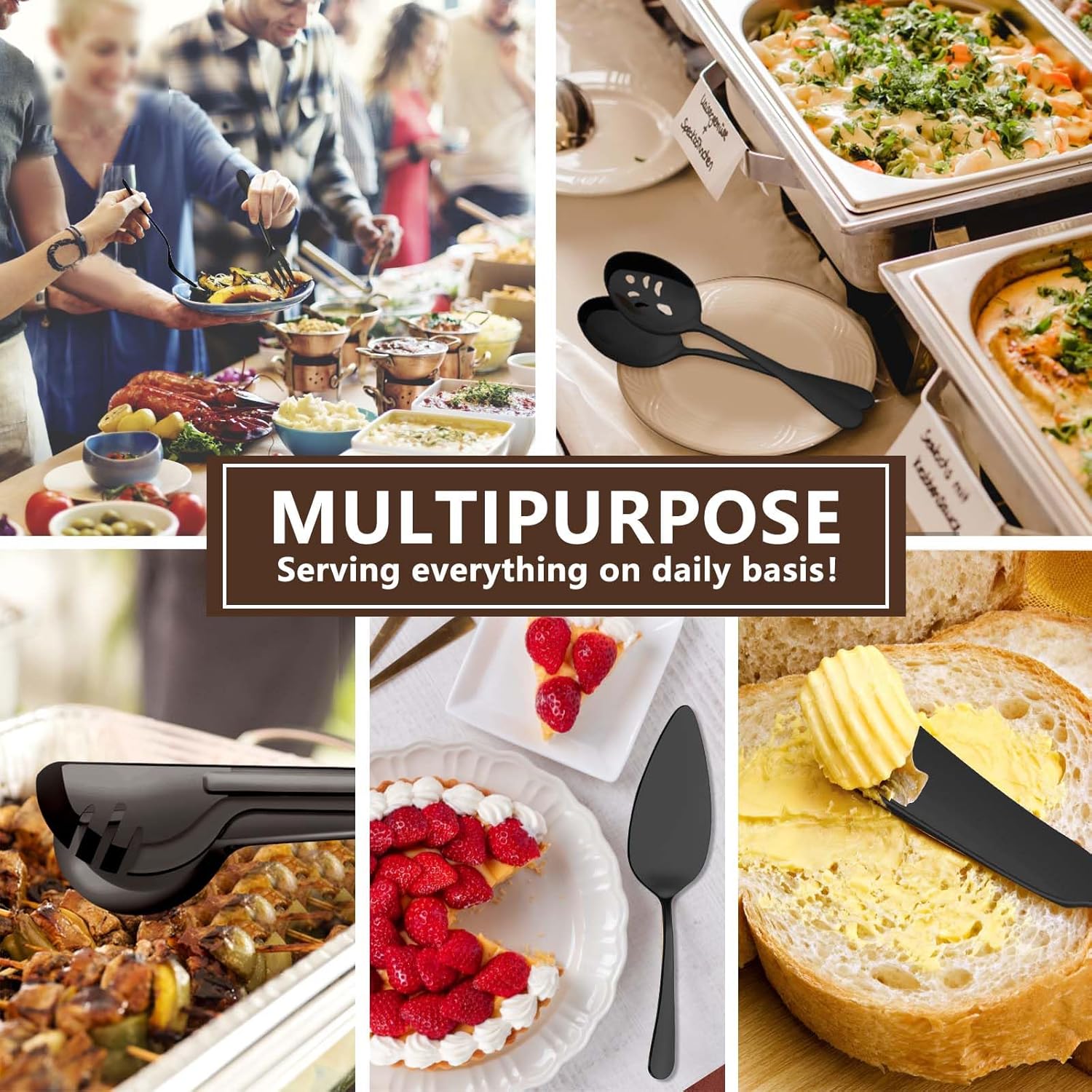 - 【Nice Buffet Serving Set】These metal black serving utensils will be very suitable for serving food, distributing solid food, picking up food, filtering food, spreading butter and jam. The classic and elegant design makes this serving utensil set perfect for most dining occasions, providing you with a cozy and enjoyable dining atmosphere