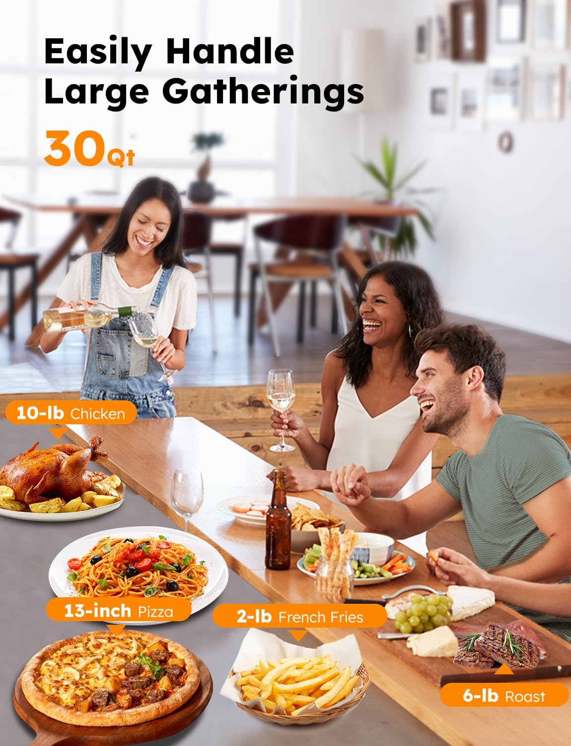 - 30QT COMPACT SIZE: This toaster oven can easily accommodate two 13-inch pizza, 10-lb Chicken, 6-lb Roast, 2-lb French Fries, making it suitable for large families. Its compact size allows it to fit perfectly in small kitchens, motorhomes, RVs