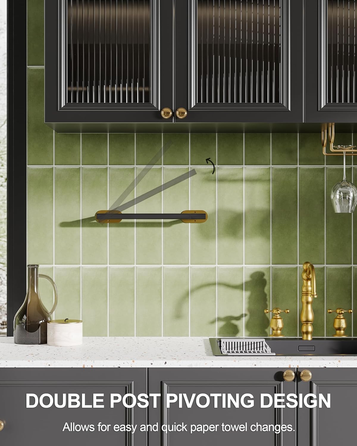 - 【DESIGN】: The double-post pivoting design makes it simple to replace the paper towels. The revolving buckle successfully keeps the kitchen towel from coming off, and the symmetrical design adds aesthetic value to your kitchen.