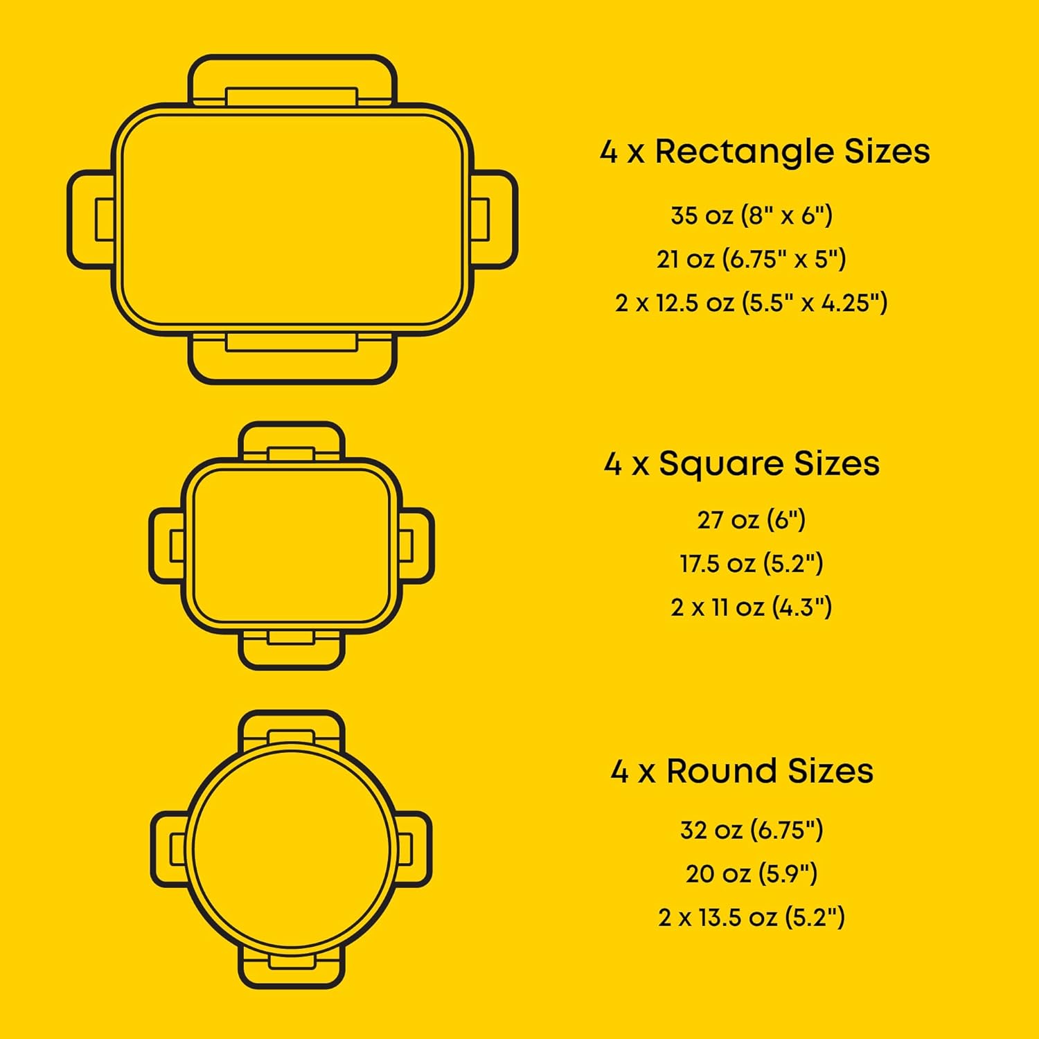 • 12 SIZES FOR EVERY NEED: Our airtight food storage containers with lids set includes 4 rectangle containers 35oz (8x6"), 21oz (6.75x5"), 12.5oz (2x 5.5x4.25"). 4 square containers 27oz (6"), 17.5oz (5.2"), 11oz (2x 4.3"). 4 round containers 32oz (6.75"). 20oz (5.9"),13.5oz (2x 5.2").