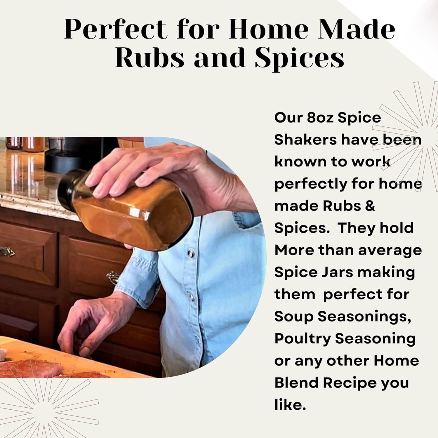- HEAVY-DUTY STORAGE CONTAINERS: These spice bottles are USA-made using reusable BPA-free materials. Each features an airtight clear glass that can be readily personalized with any decorative label, choices include Black or Red plastic shaker cover with enlarged holes on one side and a sifter on the other for a larger, more measured portion .