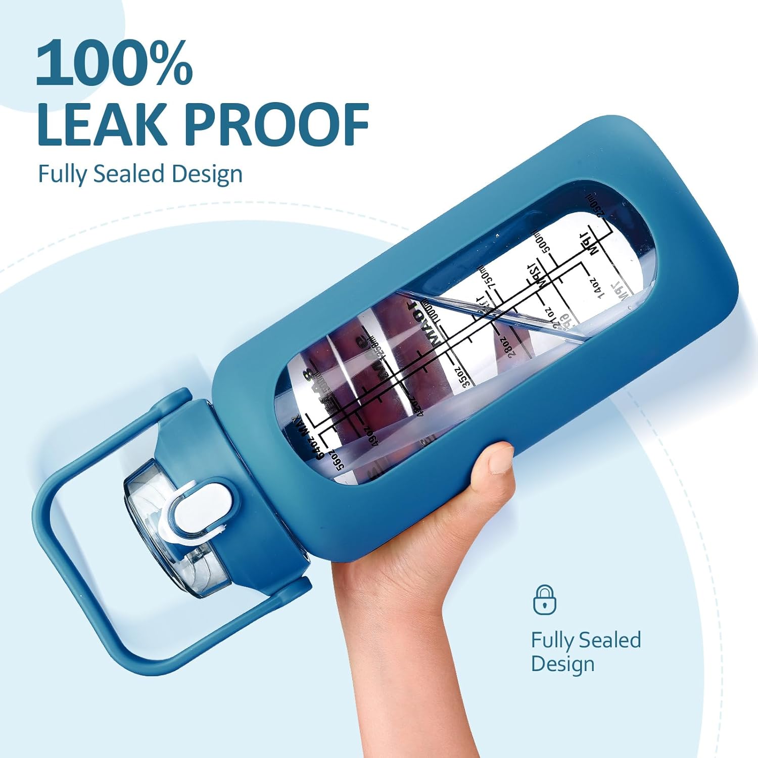 - ❤More Function- Our glass water bottle with stylish silicone sleeve which provides more grip and prevents the water bottle from slipping out. -This large motivational water bottle has a wide mouth, not only easy to hold ice cubes and fruit but also very easy to clean, you can use our complimentary cup brush to clean your water glass. -Handle on the lid for easy portability.