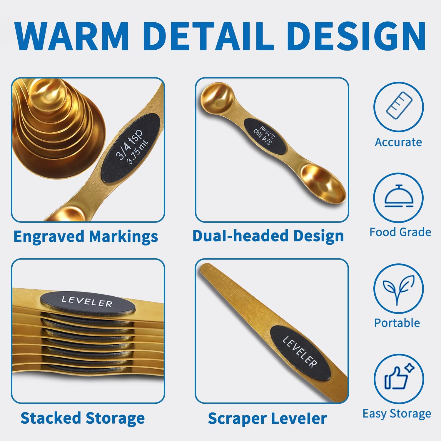 - 【Convenient Storage】Unique stackable design makes cups nest together easier, and each piece of stainless steel measuring teaspoon has an enhanced magnetic center for easy stacking together, to save kitchen space and reduce clutter, making your kitchen look neat and elegant.