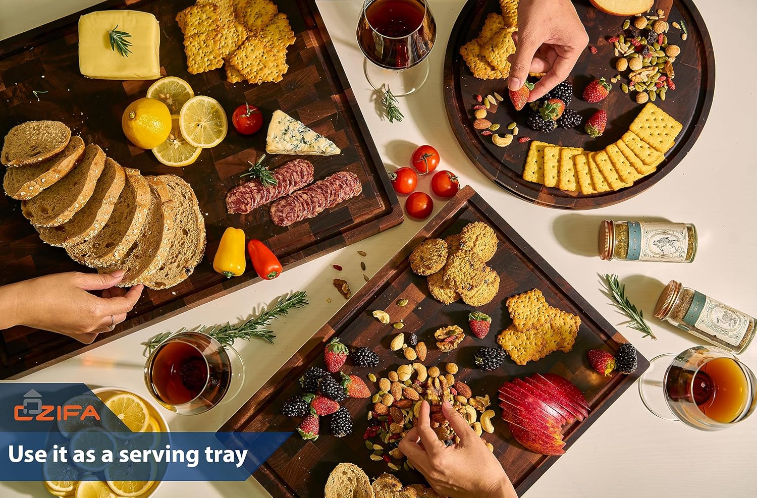 - [REVERSIBLE, MULTIPURPOSE] This large, smooth walnut wood cutting board boasts a front side with a juice groove design, seamlessly catching liquids while you cut, chop, and dice. Its spacious surface caters to all your culinary needs. Built-in handles ensure comfortable carrying and maneuvering. The back side offers a flat, versatile space for prepping ingredients, serving grilled meats, displaying cheese platters, or acting as a kitchen mat. Perfect for BBQs, parties, or everyday cooking. An housewarming gift with practicality and style.