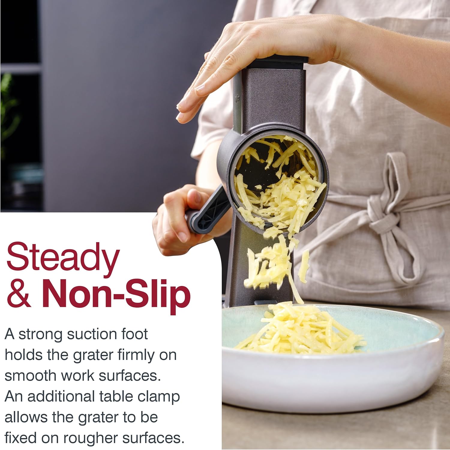 Zyliss Rotary Cheese Grater, Aluminium, 3 Steel Drum Blades, Cheese, Vegetable, Chocolate, Nut, Fruit Grater with Handle, Non-Slip Suction Foot and Table Clamp, 5 Year Guarantee