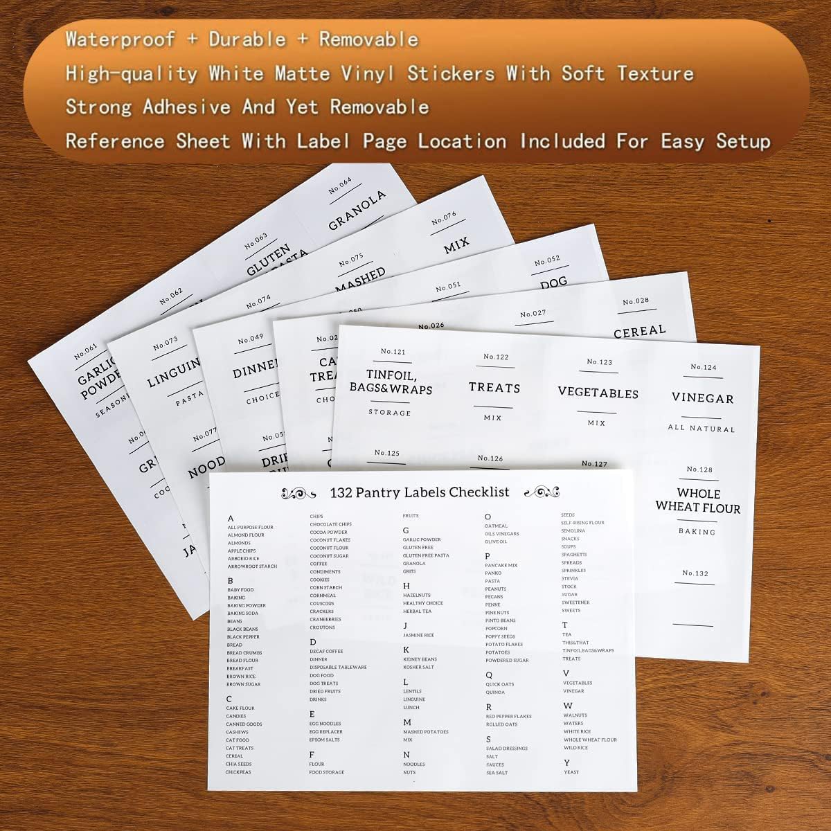- 【PERFECT FOR PANTRY】132 Kitchen labels for containers to keep your food fresh and pantry tidy. Minimalist labels are black text on white food labels stickers suitable for all airtight storage containers. Pantry decal organization labels are preprinted on premium waterproof vinyl stickers that won't tear or peel off but can easily be removed.