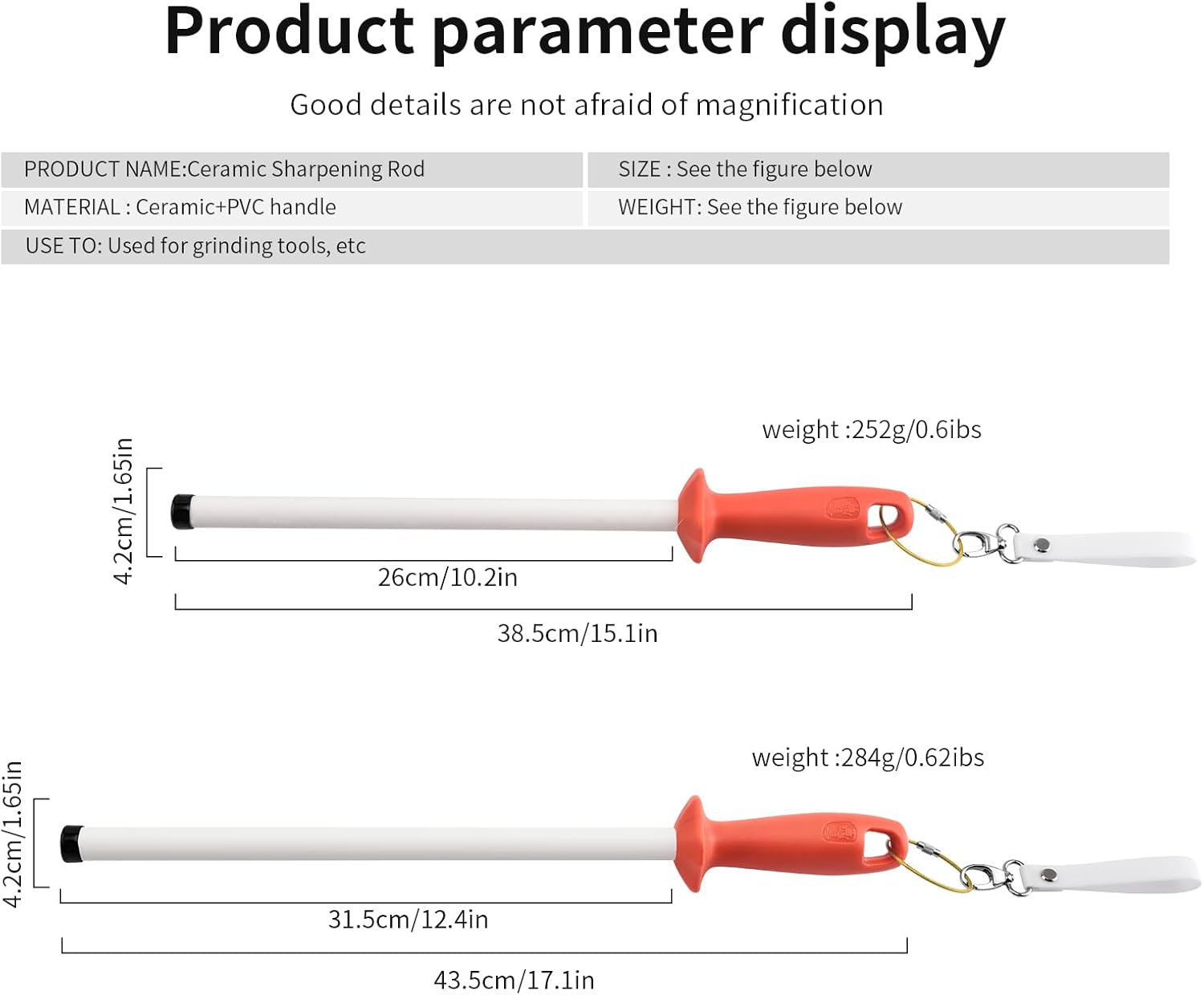 - The handle of the ceramic sharpening rod is made of frosted PVC and features a polygonal design,which not only prevents sliding but also prevents the sharpening rod from rolling off the ground. The tail of the handle has a hanging hole and is equipped with a hanging ring, which can be hung in the kitchen or on a belt. There is a detachable black soft rubber at the end to protect it from scratches.