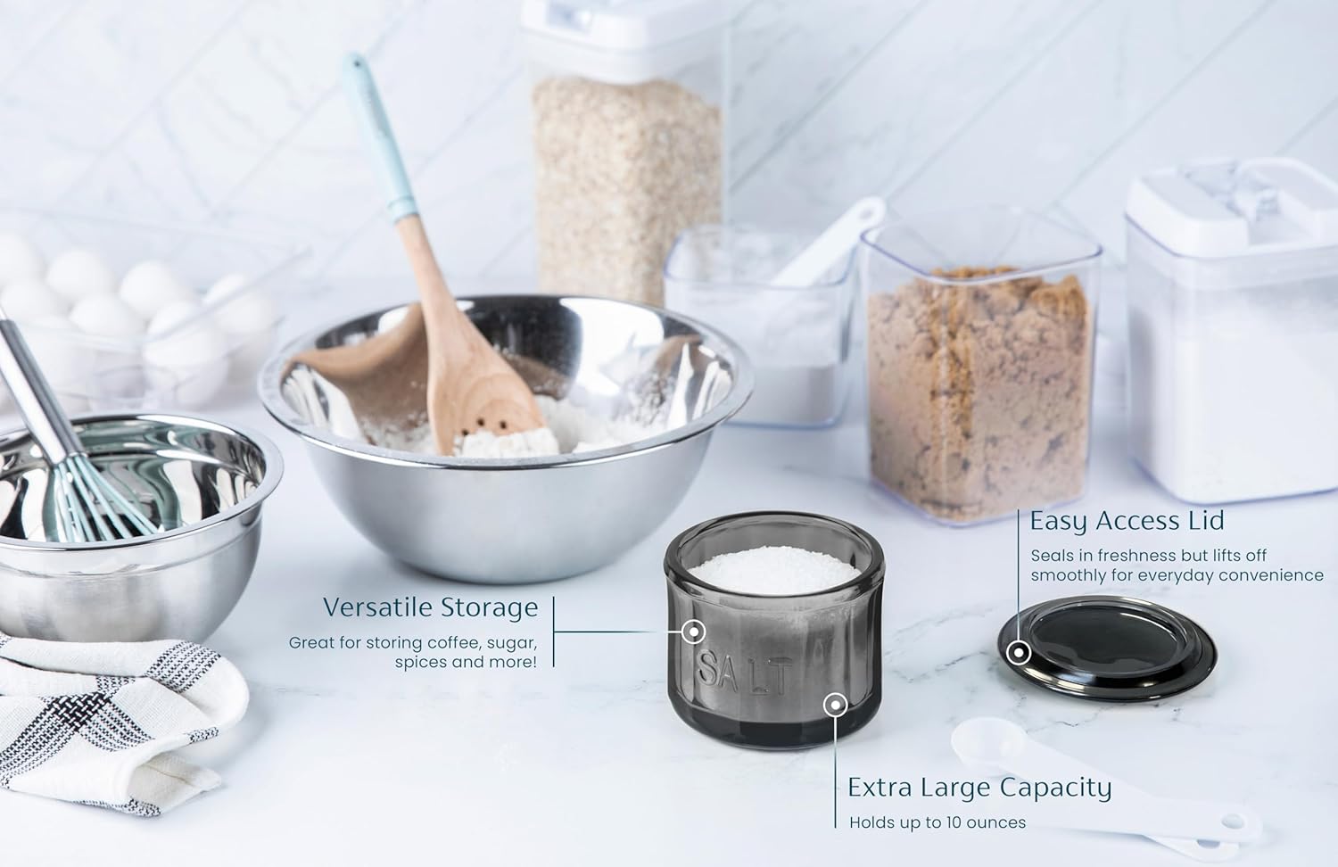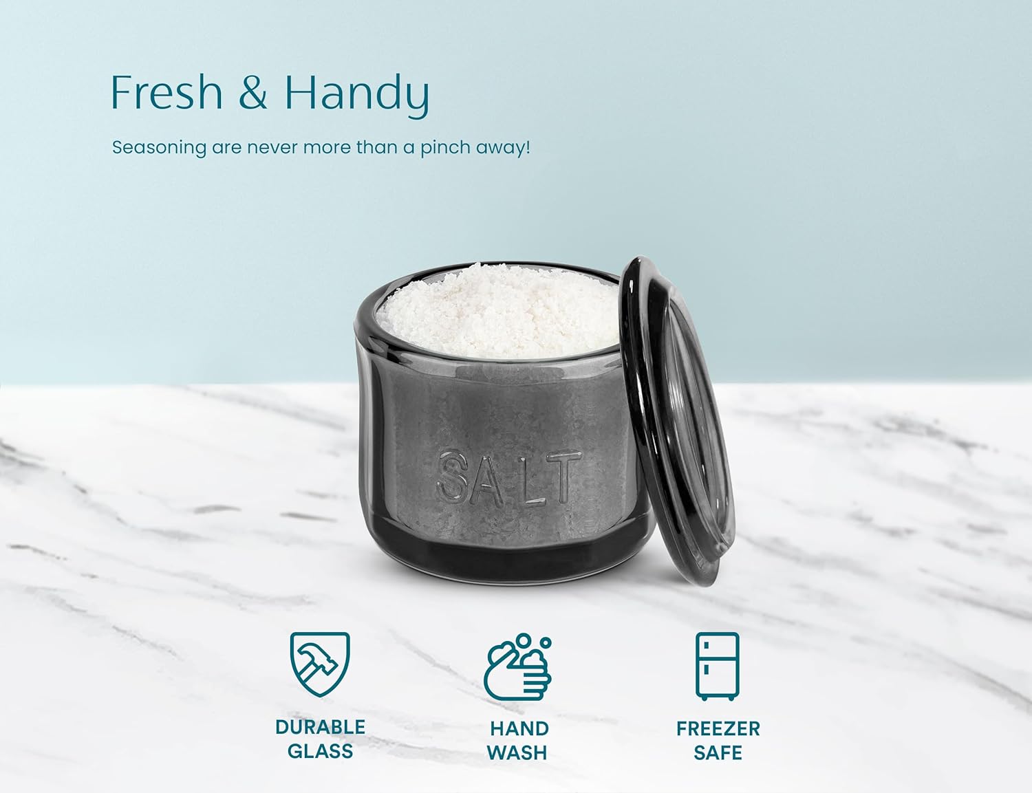 KooK Glass Salt Cellar, with Lid, Embossed Pressed Glass, Clear Storage Container, for Coffee, Sugar, Spices and Candies, 10 oz (Black)