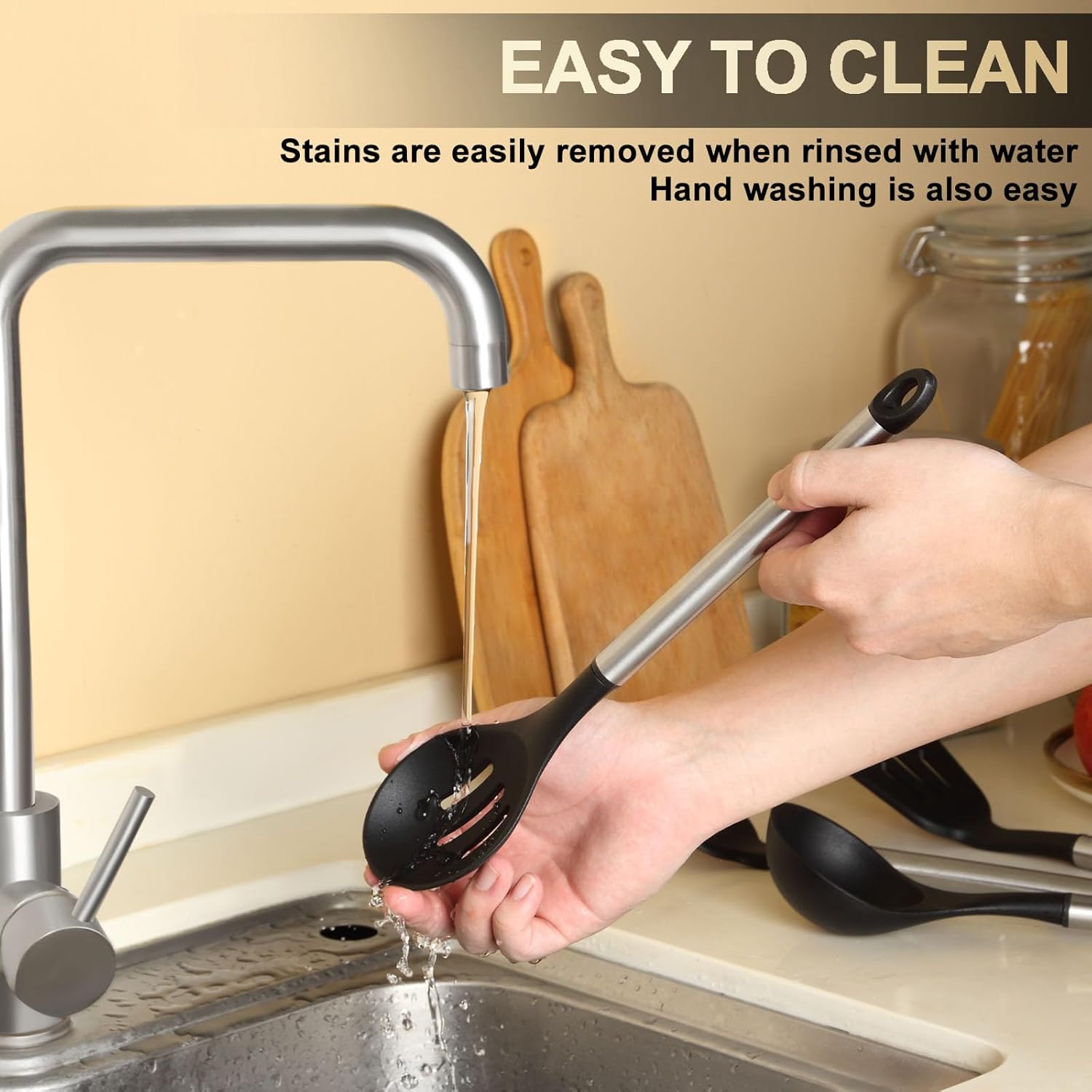 - 【High Quality & Exquisite Craftsmanship】 Our spatula and spoon sets are made of food grade silicone and stainless steel, the nanotechnology makes the silicone head and stainless steel connection more stable. Our high-quality kitchen utensils are polished with a special oil to prevent them from getting rusty. Heat resistant is up to 350 F/180℃. Even if the cooking utensils are used in the high temperature environment of frying, you don't have to worry that it will melt