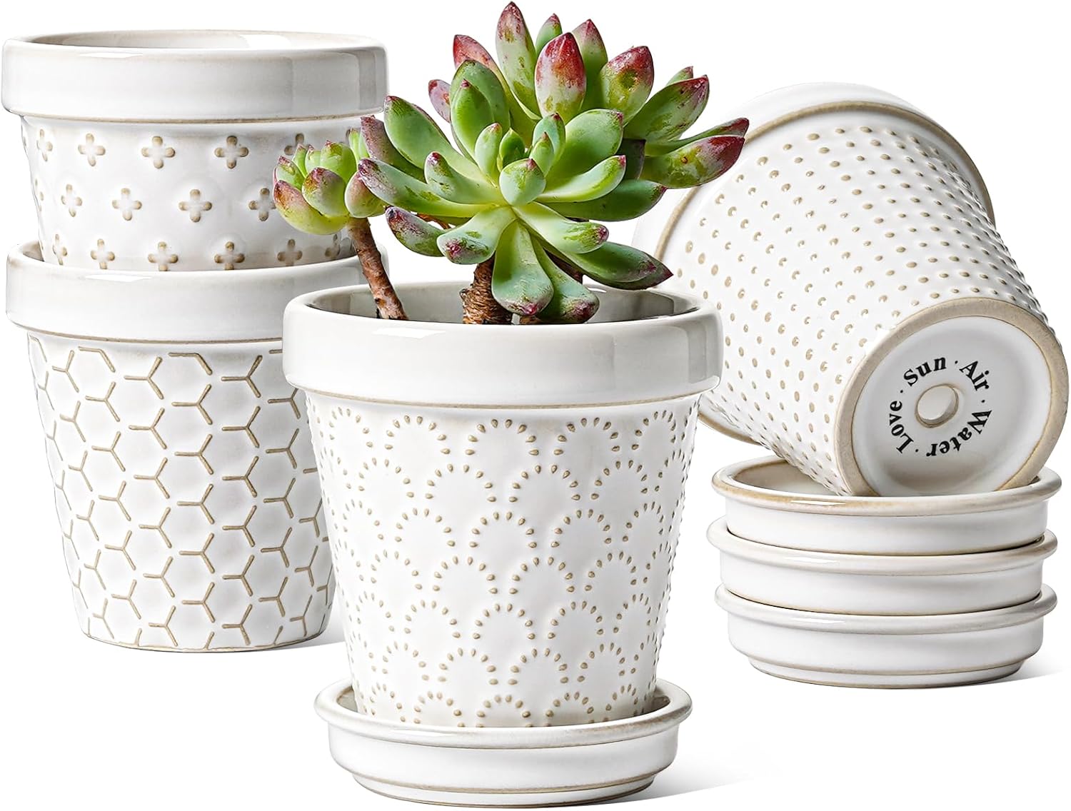 LE TAUCI Ceramic Succulent Pots, 3 Inch Mini Flower Pots for Indoor Plant Cactus, Embossed Small Plant Pot with Drainage Hole & Saucer, Home Decor - Set of 4, Arctic White