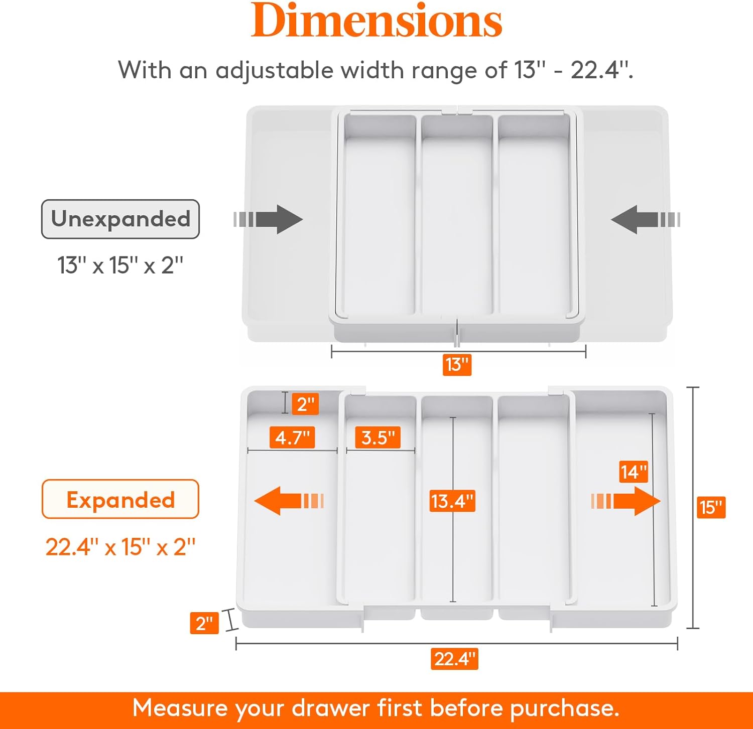 - Adjustable Design: With its retractable design, The Lifewit silverware organizer fits drawers of various sizes and shapes. It measures 13'' wide when folded while reaching 22.4'' when fully expanded. This universal utensil drawer organizer helps you maximize storage space efficiently while keeping your utensils neatly organized and easily accessible