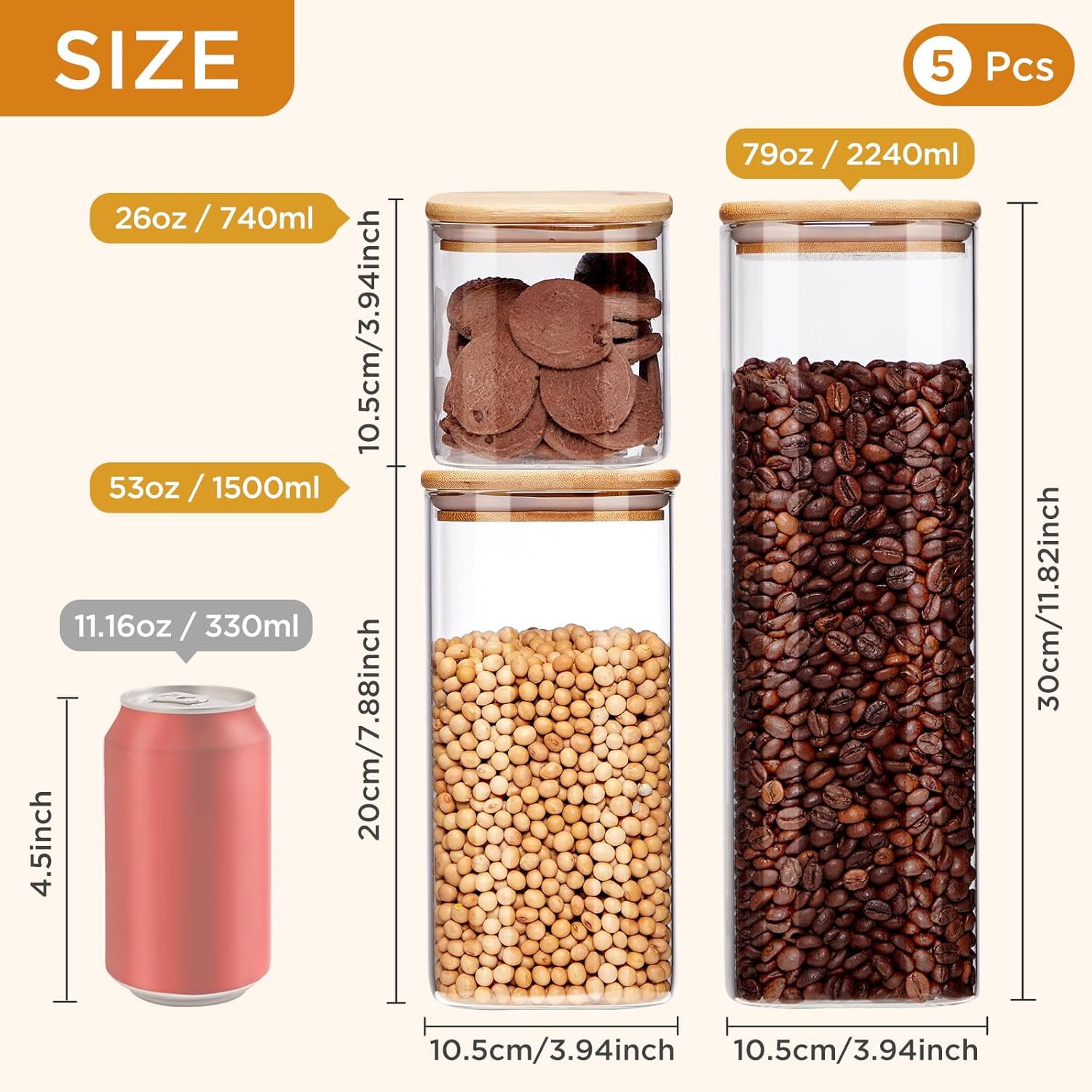 Square Glass Food Storage Jars with Lids[Set of 5], Perfect for Pasta, Cookies, Nuts, Coffee, Cereal, Flour,Organize Your Kitchen and Pantry with these BPA-Free Glass Jars with Canisters