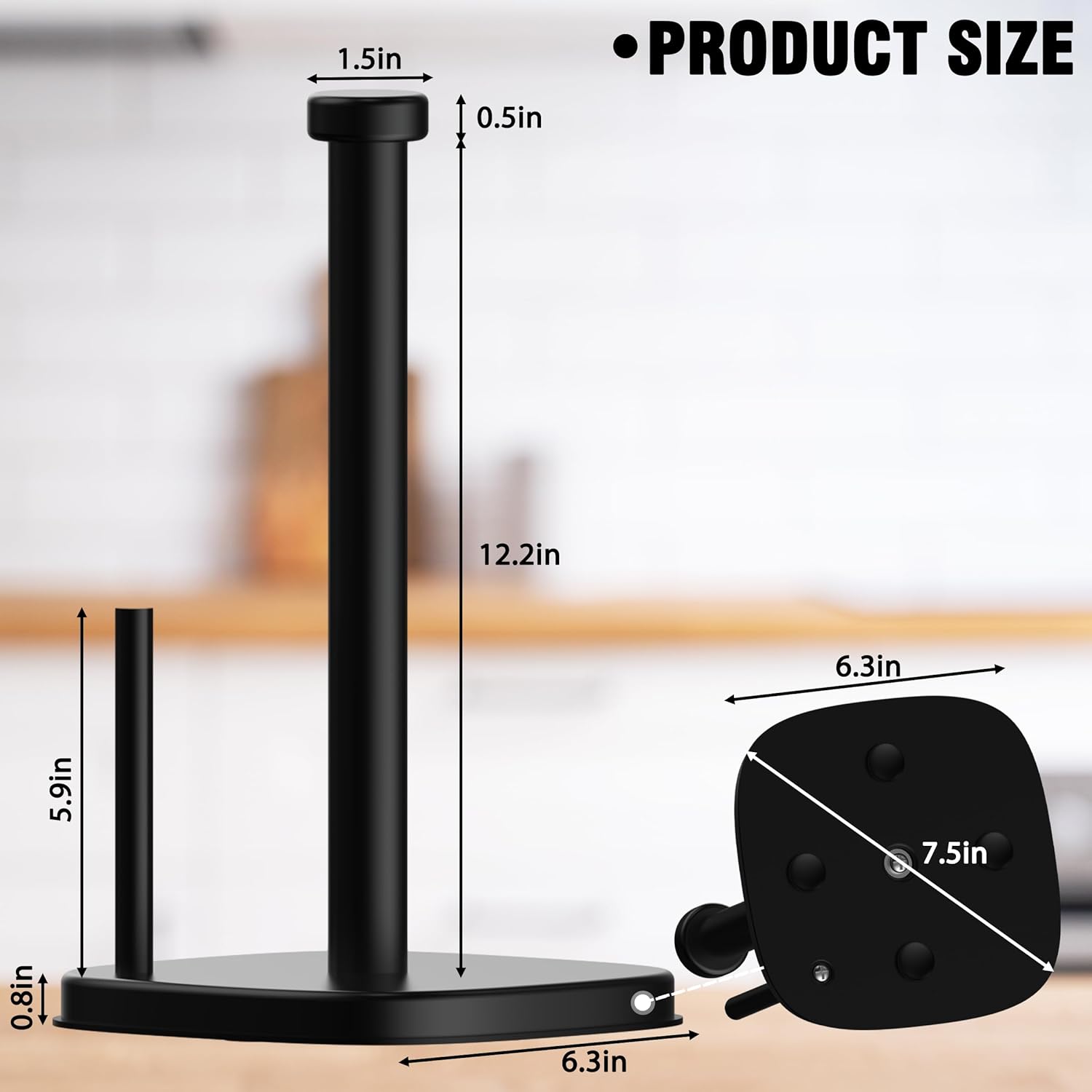 Paper Towel Holder Countertop, Standing Paper Towel Roll Holder for Kitchen Bathroom Organize, Stand with Weighted Base Suction Cups, Stainless Steel One-Handed Operation (Matte Black)