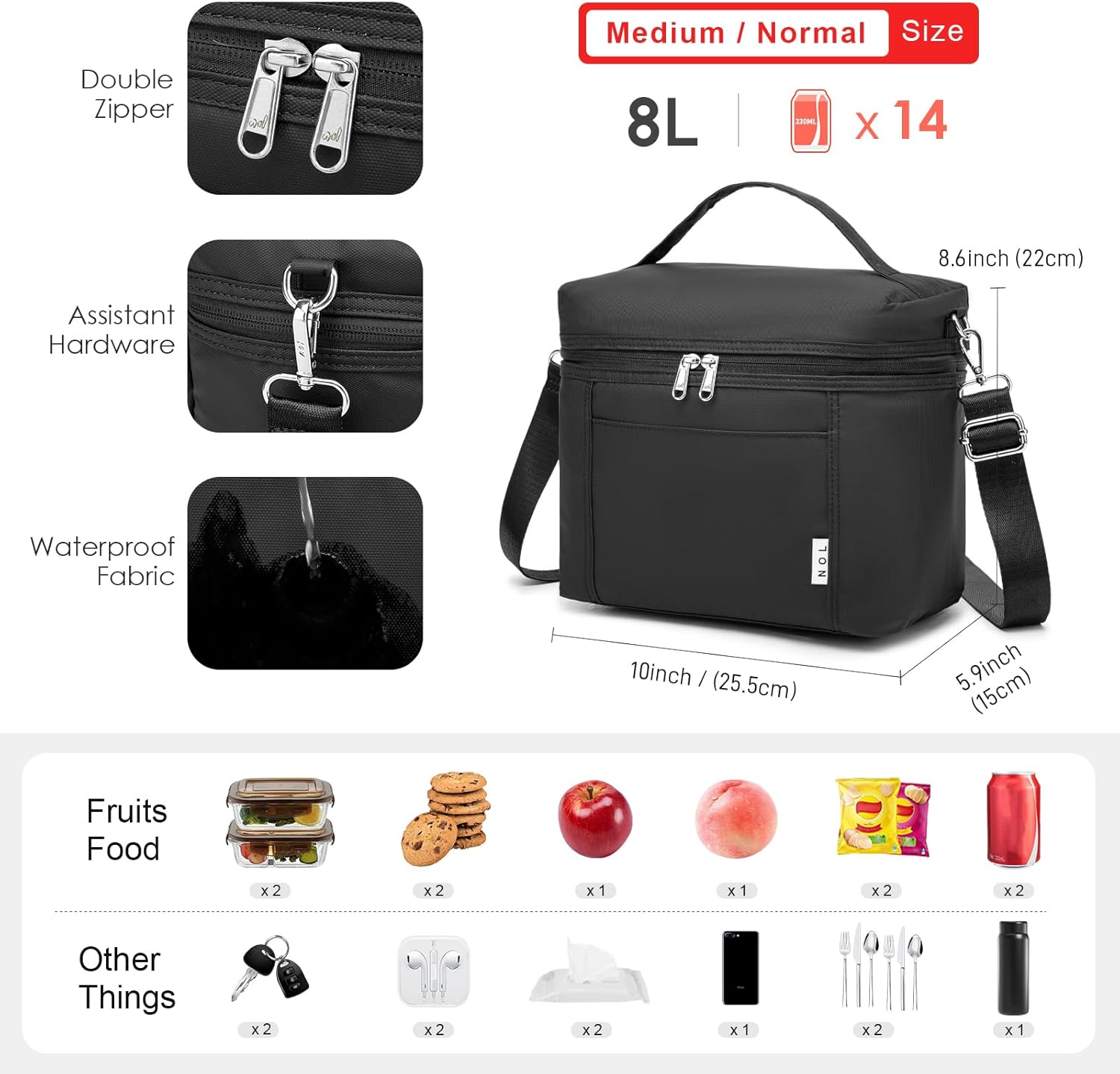 NOL Natural Organic Lifestyle Reusable Lunch Bags for Adults Lightweight Waterproof Lunch Box with Removable Adjustable Strap Insulated Leakproof Cooler Lunch Bag for Work Black Medium Size