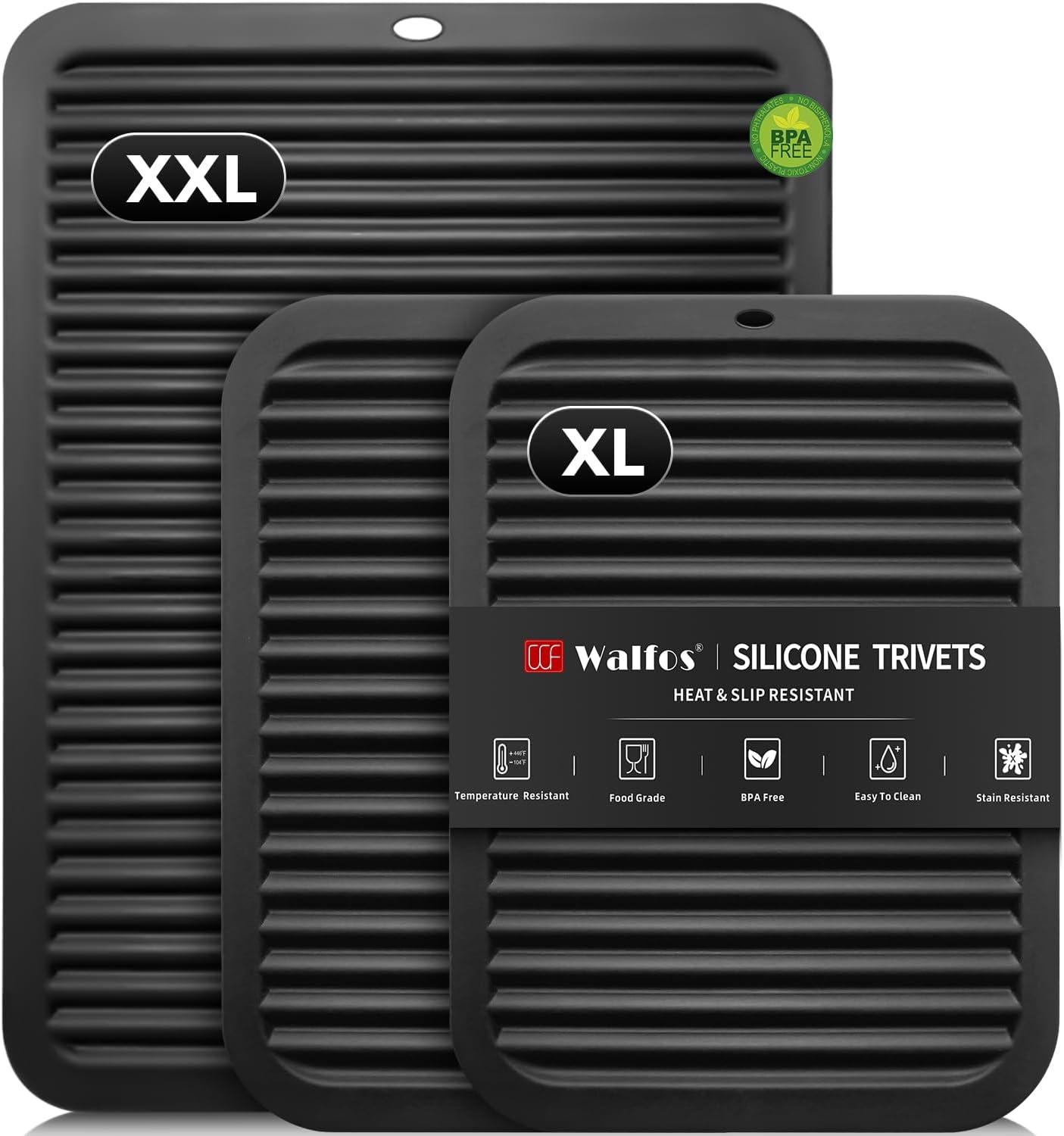 - SILICONE TRIVET SET: Walfos extra large trivet and normal size trivet set allow you to accomplish most insulation tasks, from large hot dishes, hot pots, appliances to normal hot pots and pans, hot plates etc., better protect your countertops from heat damage. Made from food-grade silicone, Walfos pot holders are BPA-free and will not attract odors, stain, rust or crack