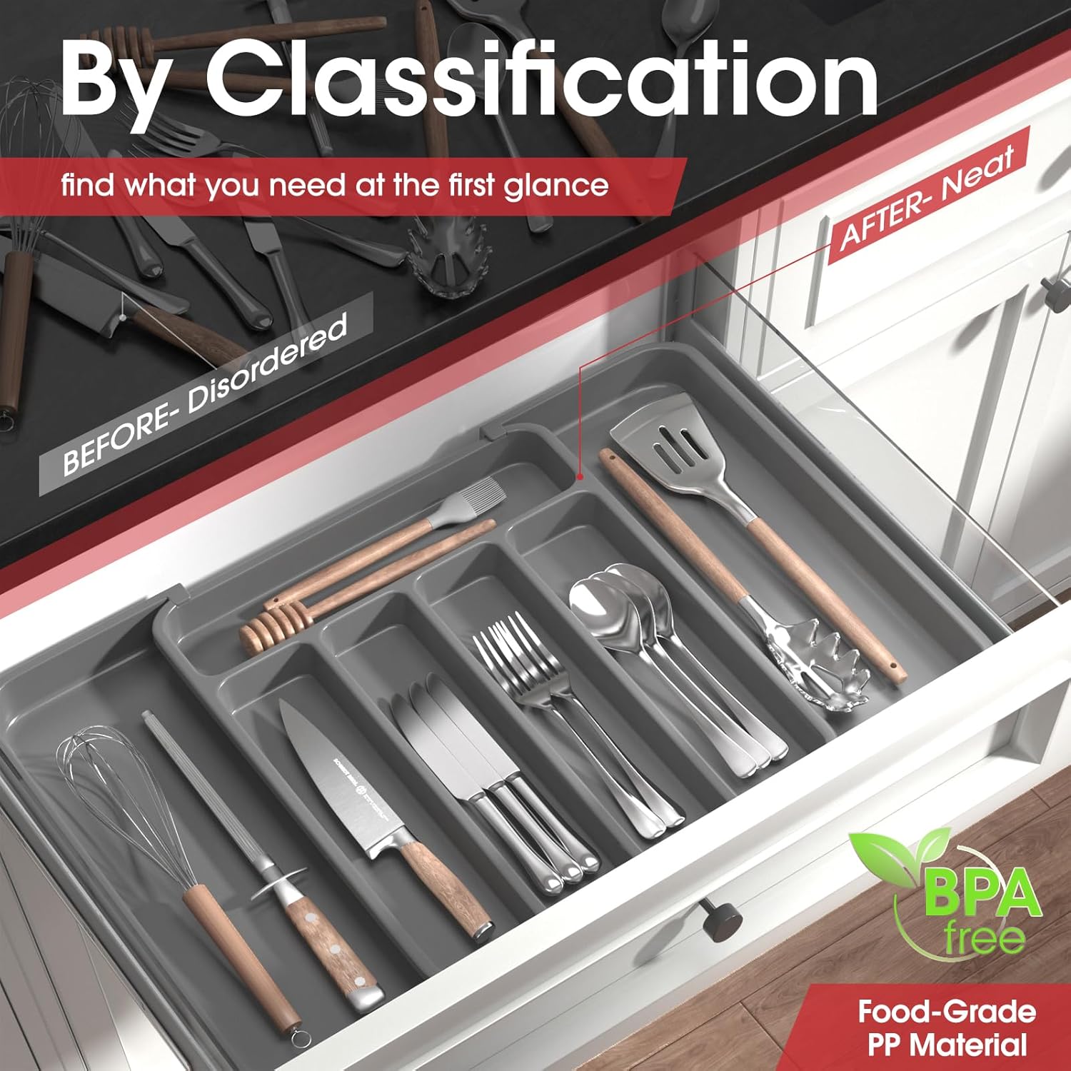 - LARGE CAPACITY: This kitchen utensil organizer comes with 5-7 compartments, creating more space in drawers for silverware, cutlery, and kitchen utensils. This installation-free gadget features a straightforward design—just place it in the drawer and let it work its magic, creating order effortlessly.