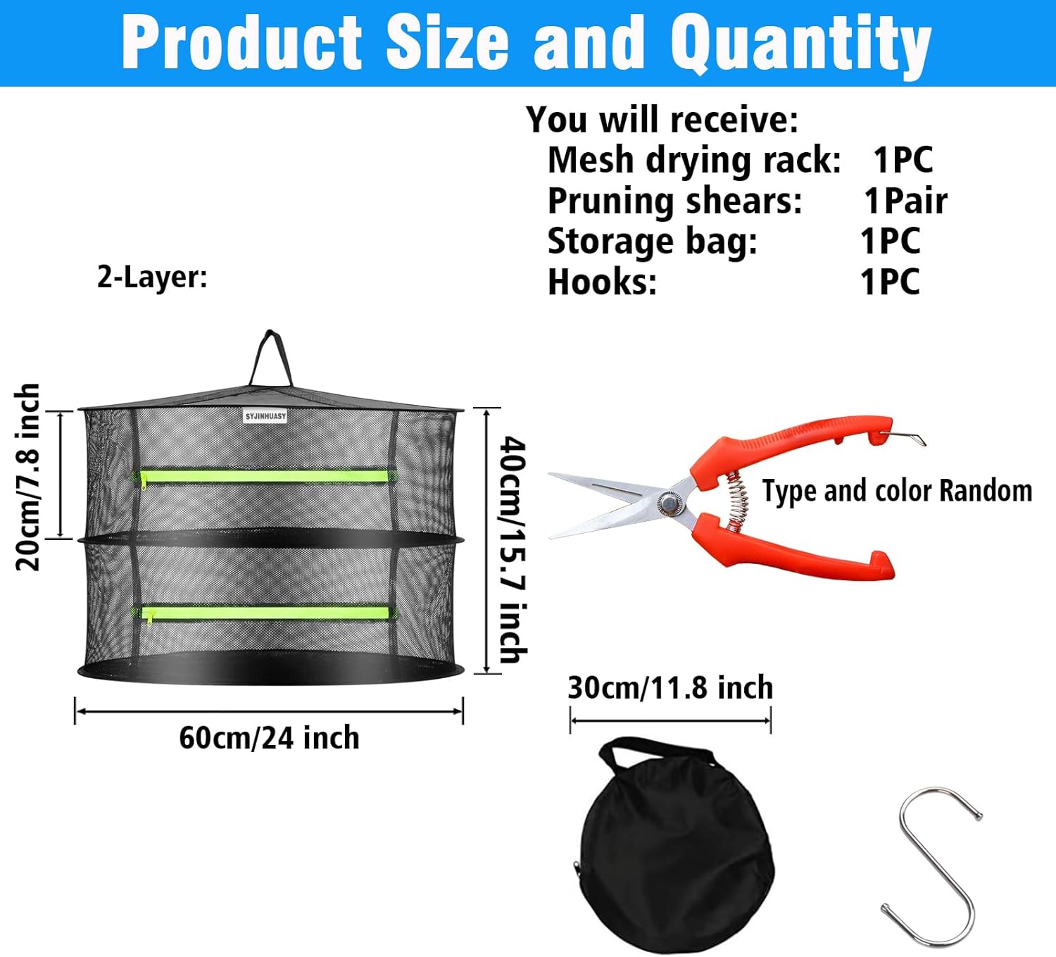 - 2-Layers Hanging Drying Rack: Our super fine mesh drying rack is designed by real-life farmers for the farmer in you.8 inch height for each layer drying racks, loading a lot things and keep a great ventilation for drying. Can be used for herbs,jerky,meat,plants fish,clothes,nuts and etc.