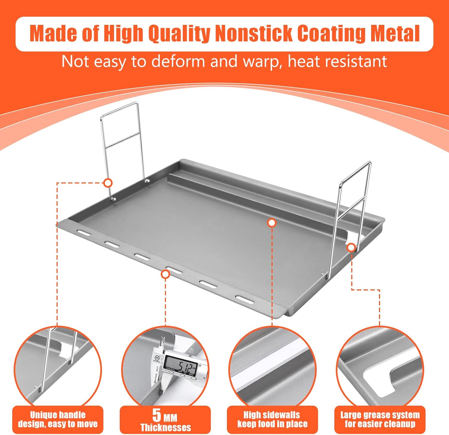 - đ„ăUpgraded Featuresă1. The 5mm thick material is built to last, offering excellent heat resistance and wonât easily deform. 2. Unique handle design, Easily place and remove the griddle from your grill with the unique handle for added convenience. 3. The large grease system makes cleaning grease, oil, and food residues effortless, while preventing flare-ups. 4. Side walls helpKeep food on the griddle and prevent spills or splatters for a cleaner cooking experience. 5. Smooth, polished edges to prevent scratching and ensure durability