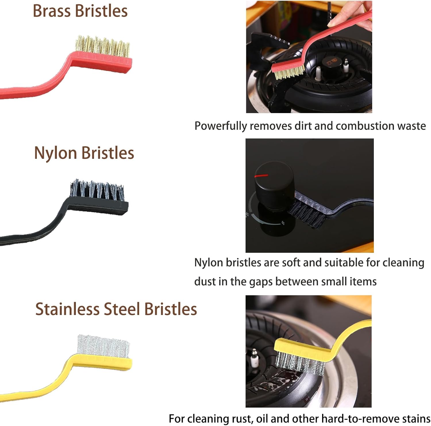 - Premium quality materials: The crevice brush features high-quality bristles, While the three small wire brushes are crafted with bristles of brass, stainless steel, and nylon. The dirt scraper is designed to tackle a wide range of stubborn dirt