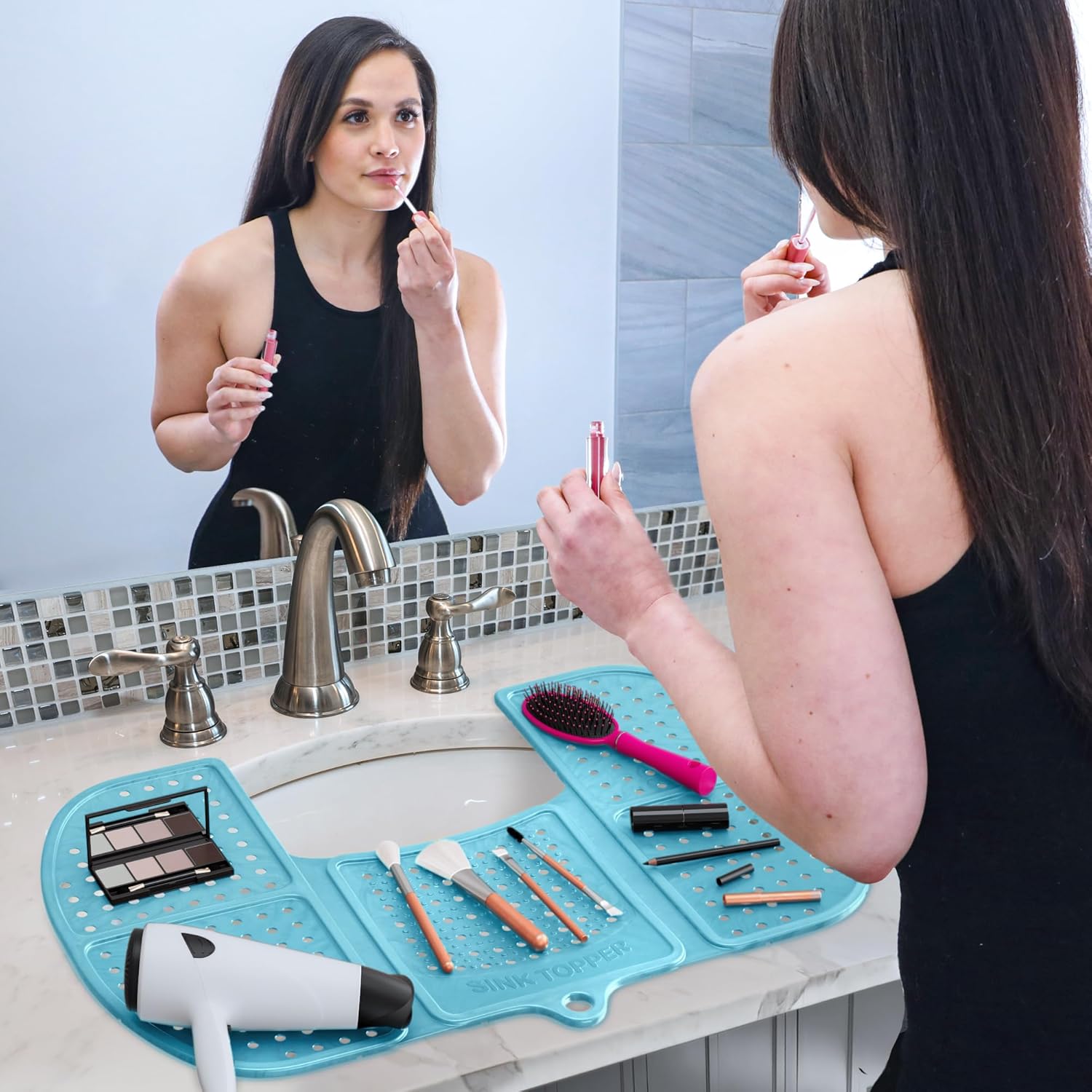 - DECLUTTER YOUR SPACE: Clear clutter with this silicone sink mat solution that supports up to 7 lbs—great as sink protectors for bathroom sink storage of beauty tools, brushes, and toiletries.