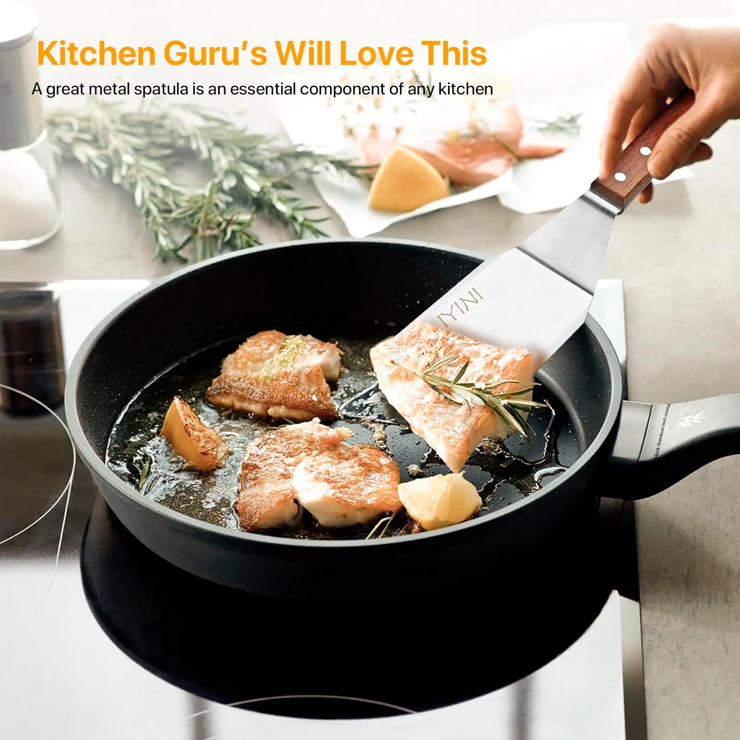 2 Pcs Stainless Steel Spatula Turner for Cast Iron Skillet, Grill Spatula with Wooden Handle, Heavy Duty Pancake Turner Metal