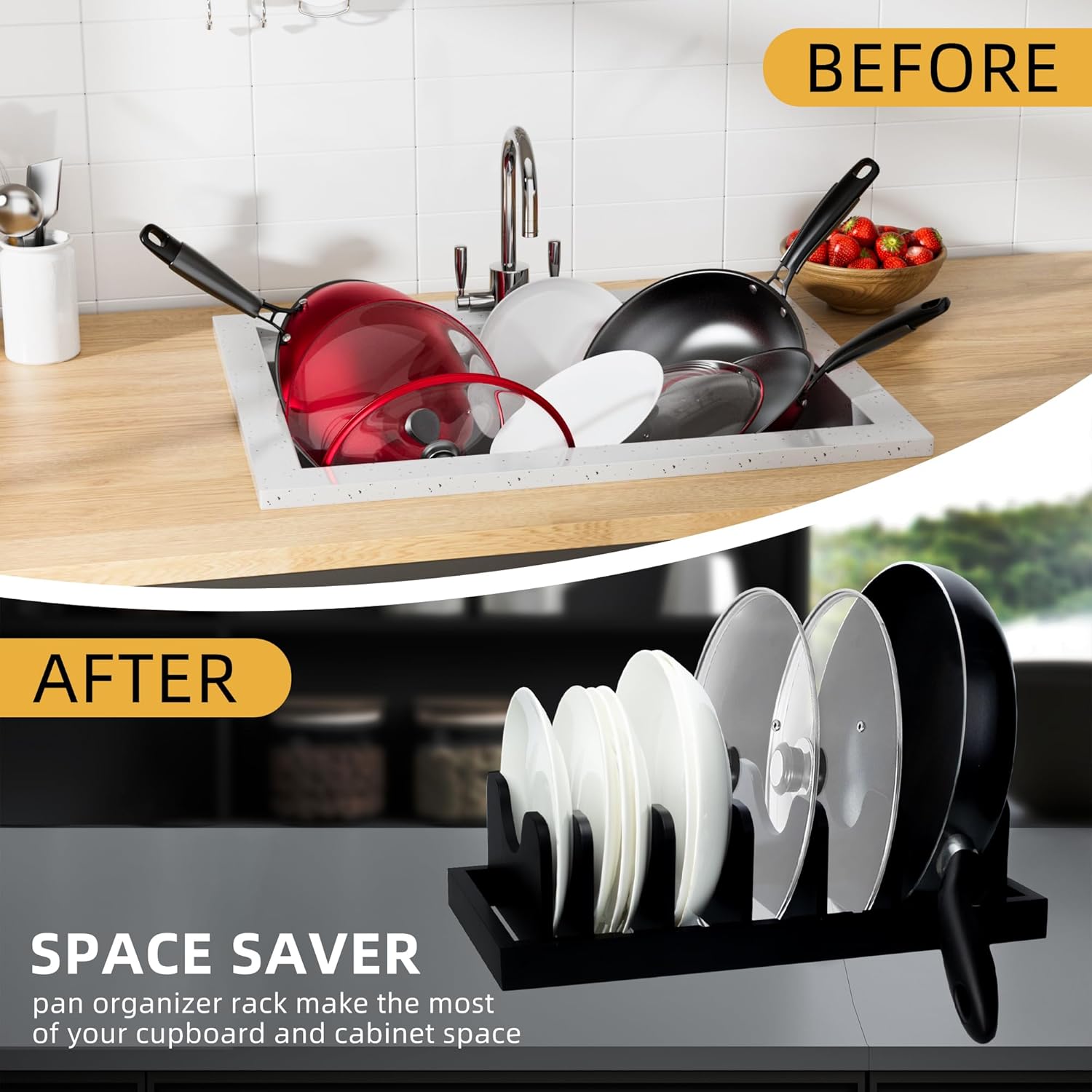 - Widely Used and Stored: Use our pot racks to organize your pots, pans, cast iron, lids, trays and bakeware, it will help you save more cabinet and countertop space in the kitchen,very perfect pan organizer rack for cabinet