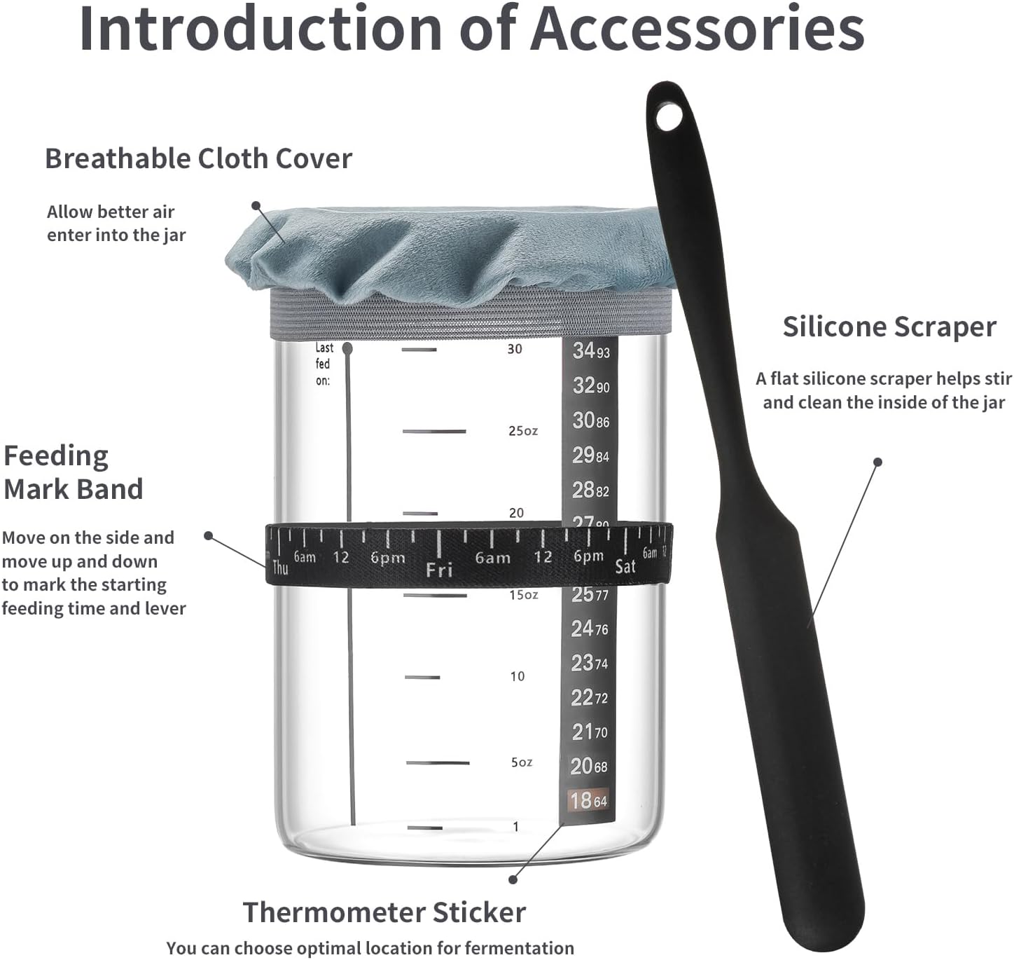 - 【Never Forget The Last Time You Fed Your Starter】:An instant-read thermometer will help monitor the temperature of your starter and ensure that it's in the optimal range for increasing fermentation activity.Elastic band marked with the days of the week & the time of day gives you an accurate indication of when you last fed your sour dough starter and the starting feeding level.