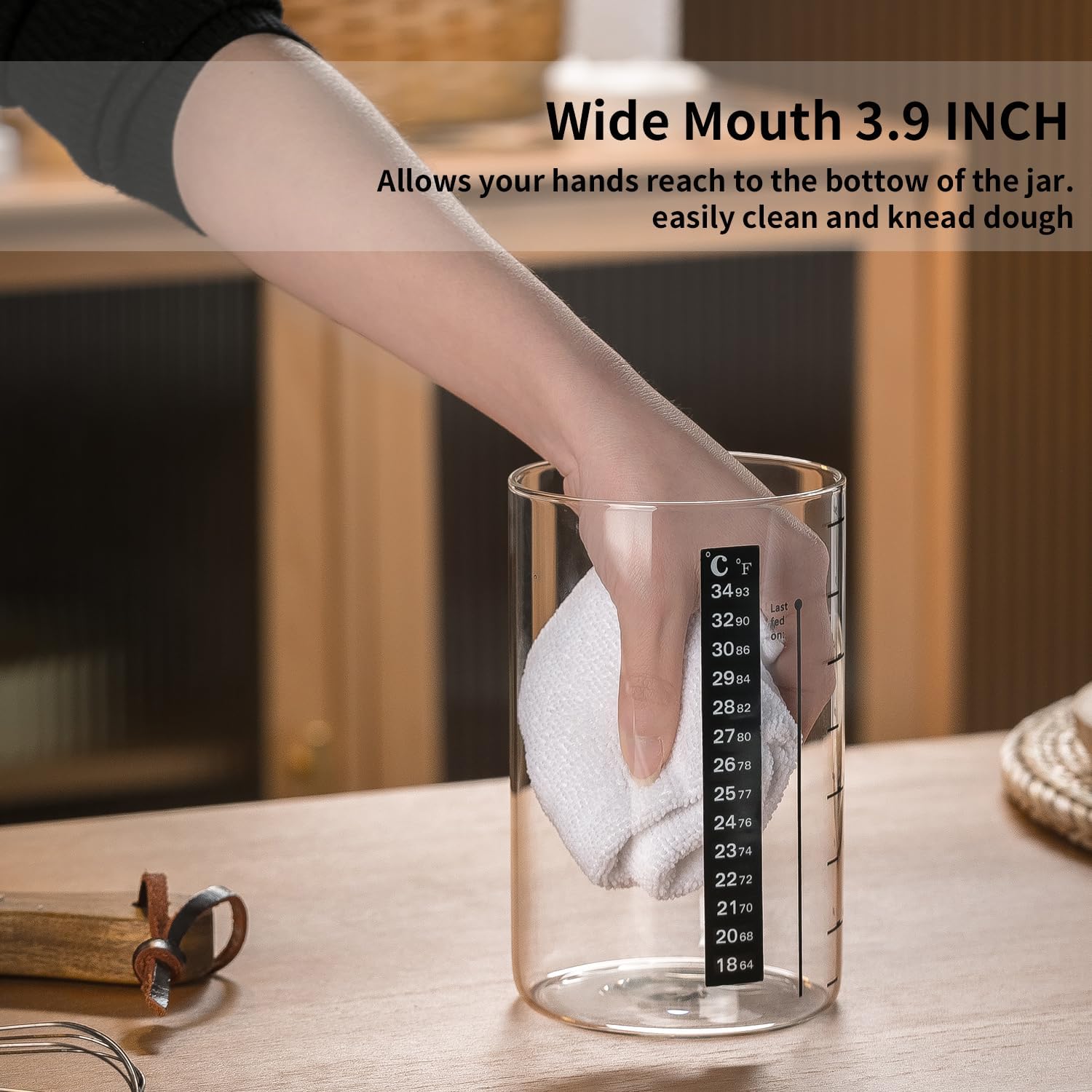 - 【3.9 inch wide mouth with Ounce Scale line】: You will receive two 35oz wide-mouth sourdough jar with Ounce scale lines,what's included:Two dough scraper, Two thermometer, Two marked date feeding band, Two breathable cloth cover and Two stailess steel lid,Wide mouth jar for easy adding, stirring & cleaning.