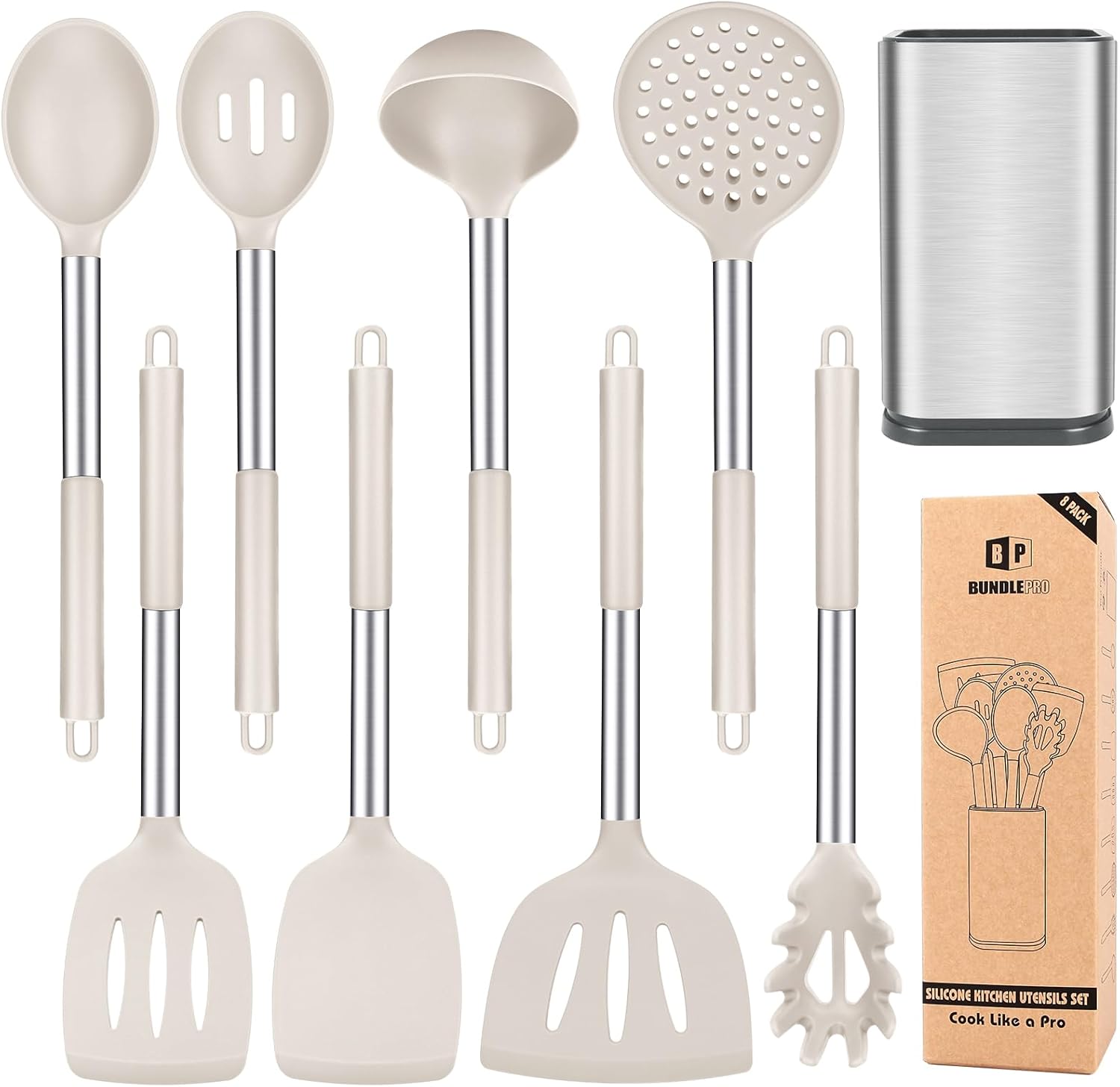 Silicone Cooking Utensil Set, 8Pcs Non-stick Cookwares with Stainless Steel Handle, BPA Free Heat Resistant Kitchen Tools with Spatulas, Turners, Spoons, Skimmer and Pasta Fork (KHAKI)