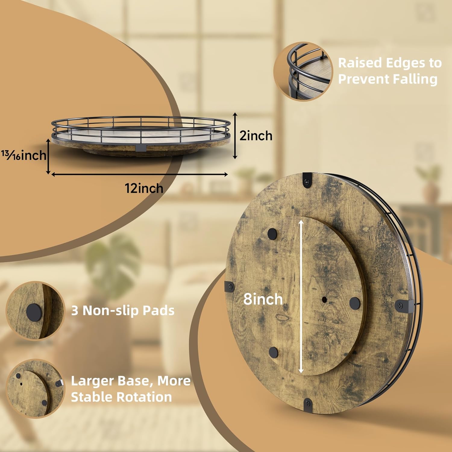Lazy Susan Turntable Organizer for Table Top, 12’’ Round Wooden Lazy Susan for Cabinet Kitchen Countertop Pantry Dining Coffee Table for Condiments Spices, Rustic Bathroom Vanity Tray for Soap Candle