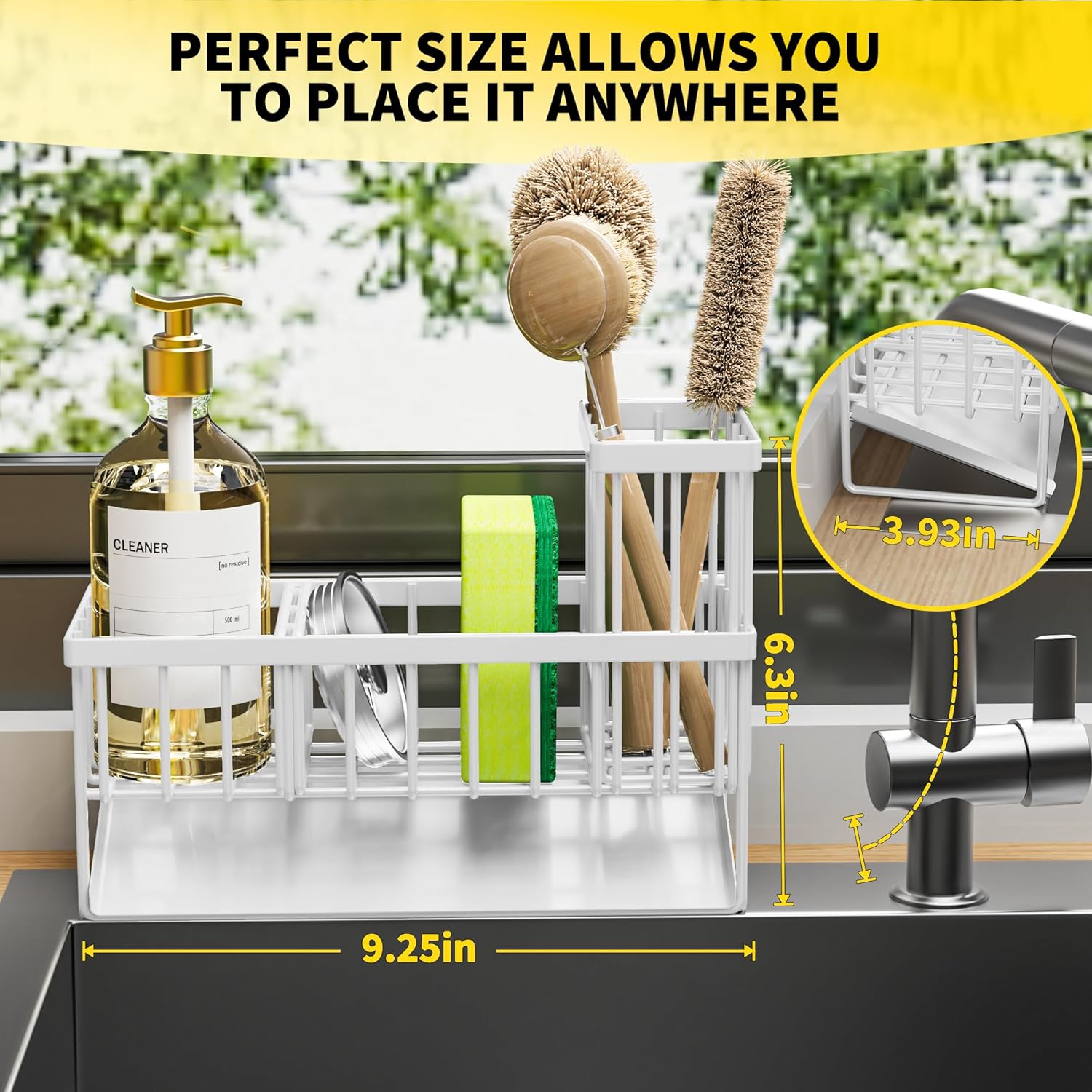 - ăSMALL VOLUMEă Cisily sponge holder is suitable for kitchens with limited space. It measures only 9.25"*3.97"*6.37", Holds a detergent bottle, a sponge ball and sink stopper. With an extra upgraded brush holder that can hold up to 4 small and large sized brushes, with the Cisily Sink caddy you can save countertop space perfectly.