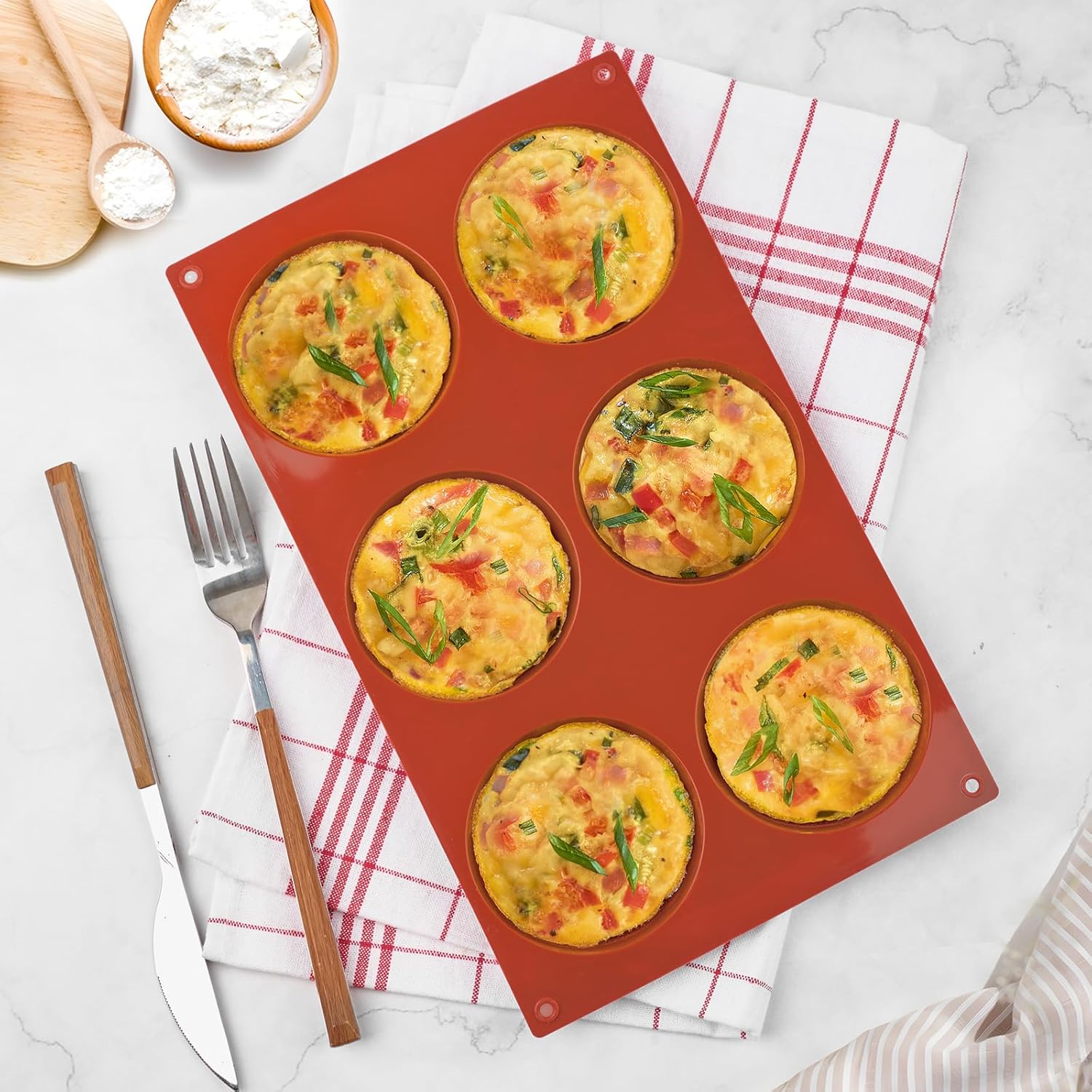 - Non-Stick: These silicone muffin top pans have a smooth surface. You just need to gently press the bottom of the mold to pop out delicious egg muffins