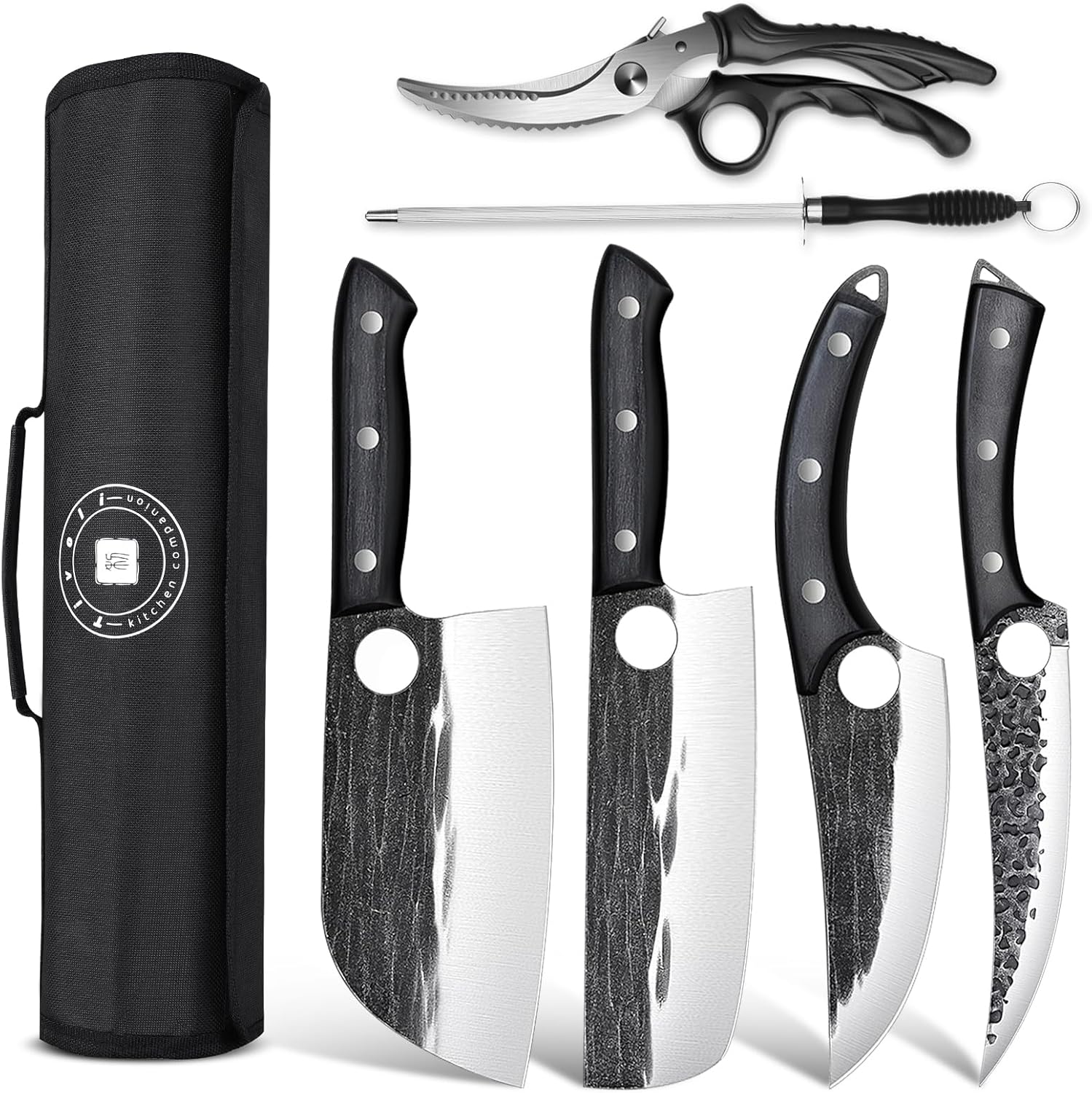 - 【High Carbon Steel knife set】: The Butcher Knife Set for kitchen is made from premium high-carbon steel. Crafted by skilled artisans with rich forging experience and utilizing modern CNC technology, every detail of high-temperature forging and quenching is meticulously controlled, this ensures that each knife in our set achieves a Rockwell hardness of 59. This forged blade knife set will be your most reliable companion in the kitchen.