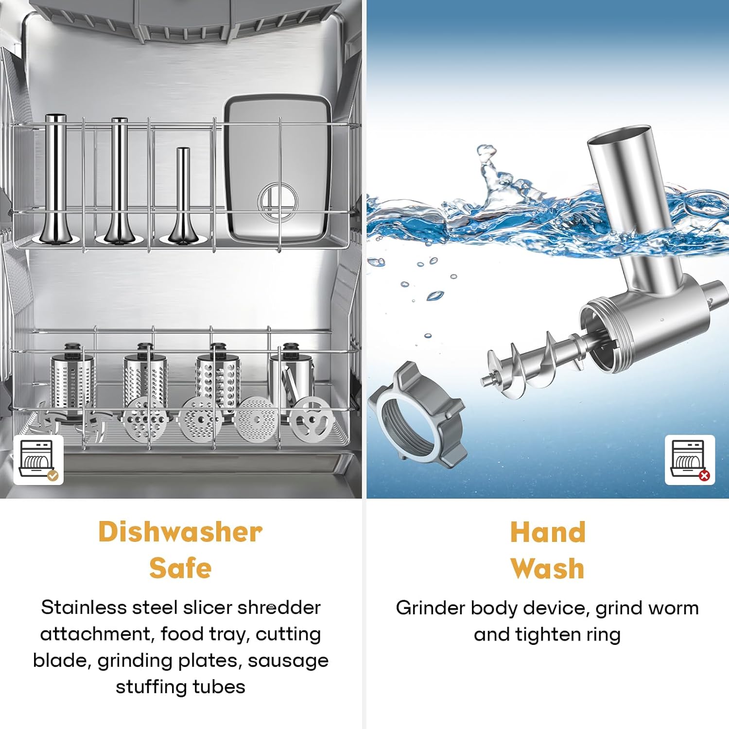 - Easy to Clean and Support: For kitchenaid mixer attachments only the slicer shredder attachments are dishwasher safe. The meat grinder attachmnet recommend washing by hand, cleaning it with soap, warm water (shall not exceed 122 ℉). The provided cleaning brush can clean any hidden crevices or corners. If you have any questions about the product, please contact us.