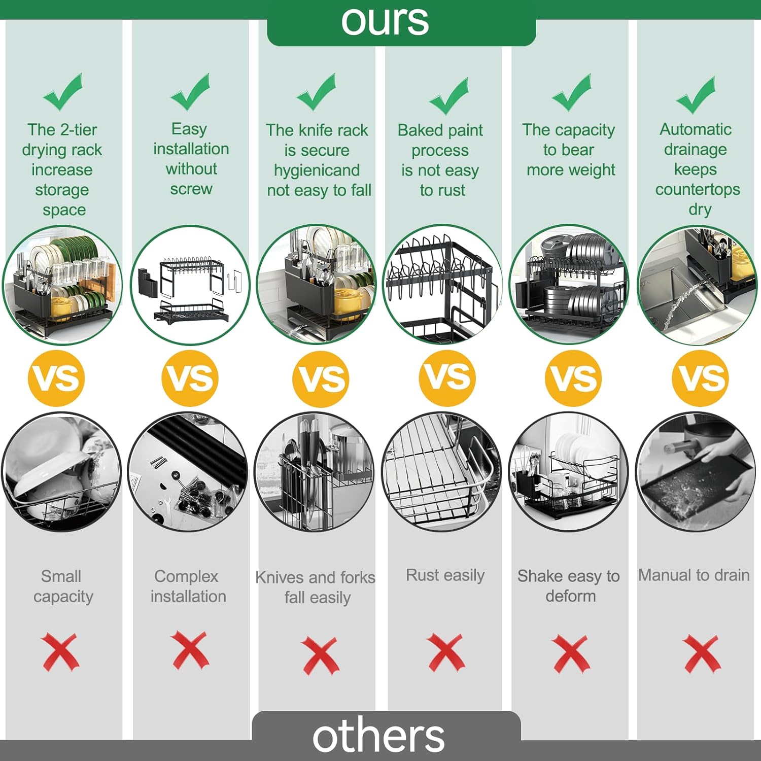 - Versatile Storage Solutions:Elevate your dish drying experience with our 2 tier dish drying rack. The two-tier design sets our dish drying rack apart, with the upper level featuring a full-size layout that surpasses most competitors in capacity. Thoughtful features on the side of the dish racks for kitchen counter give you ample drying space.