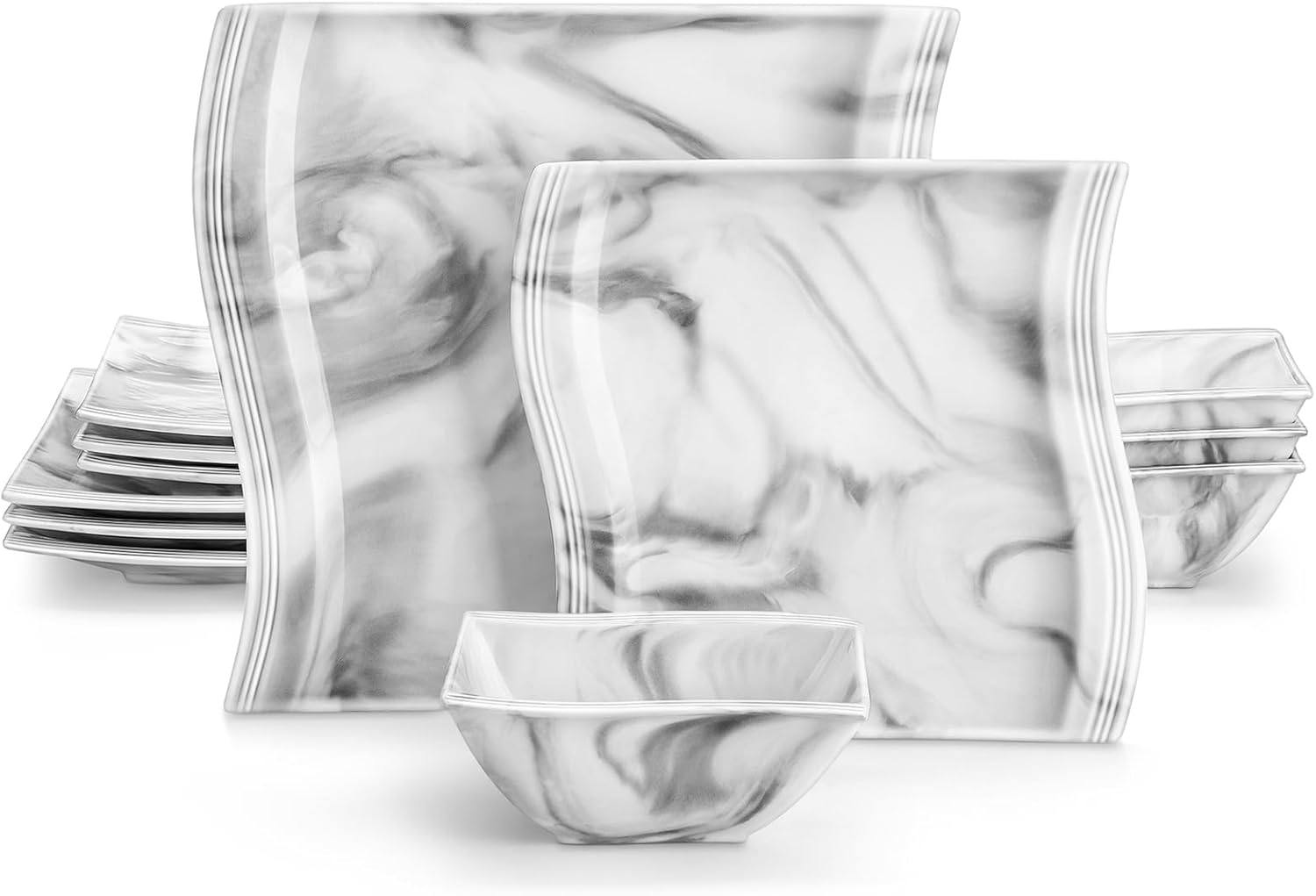 MALACASA Plates and Bowls Sets, 12 Pieces Modern Porcelain Dinnerware Sets for 4, Marble Dishware Set Kitchen Dining Ware Set, Square Ceramic Dish Set, Microwave and Dishwasher Safe, Series Flora