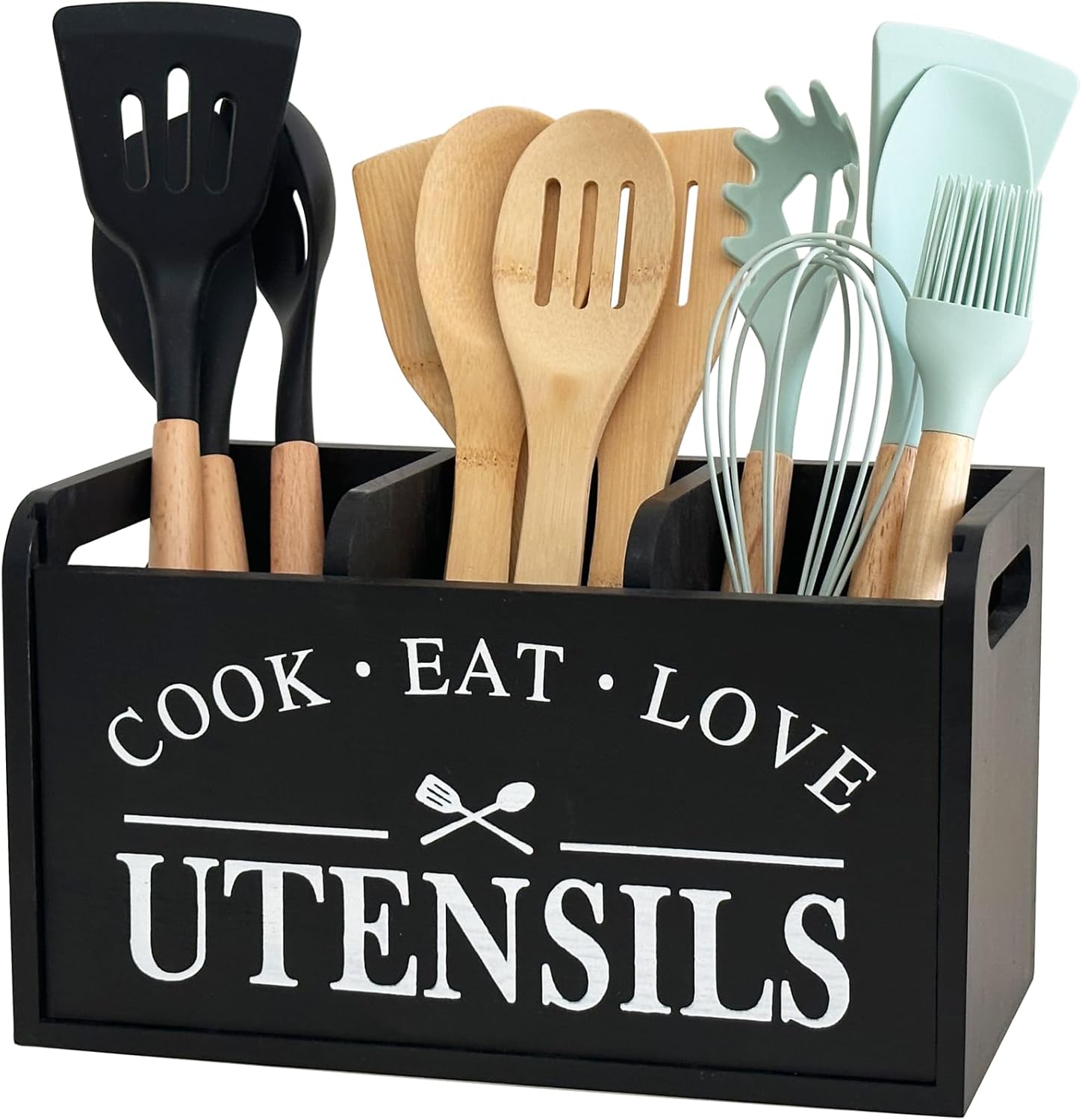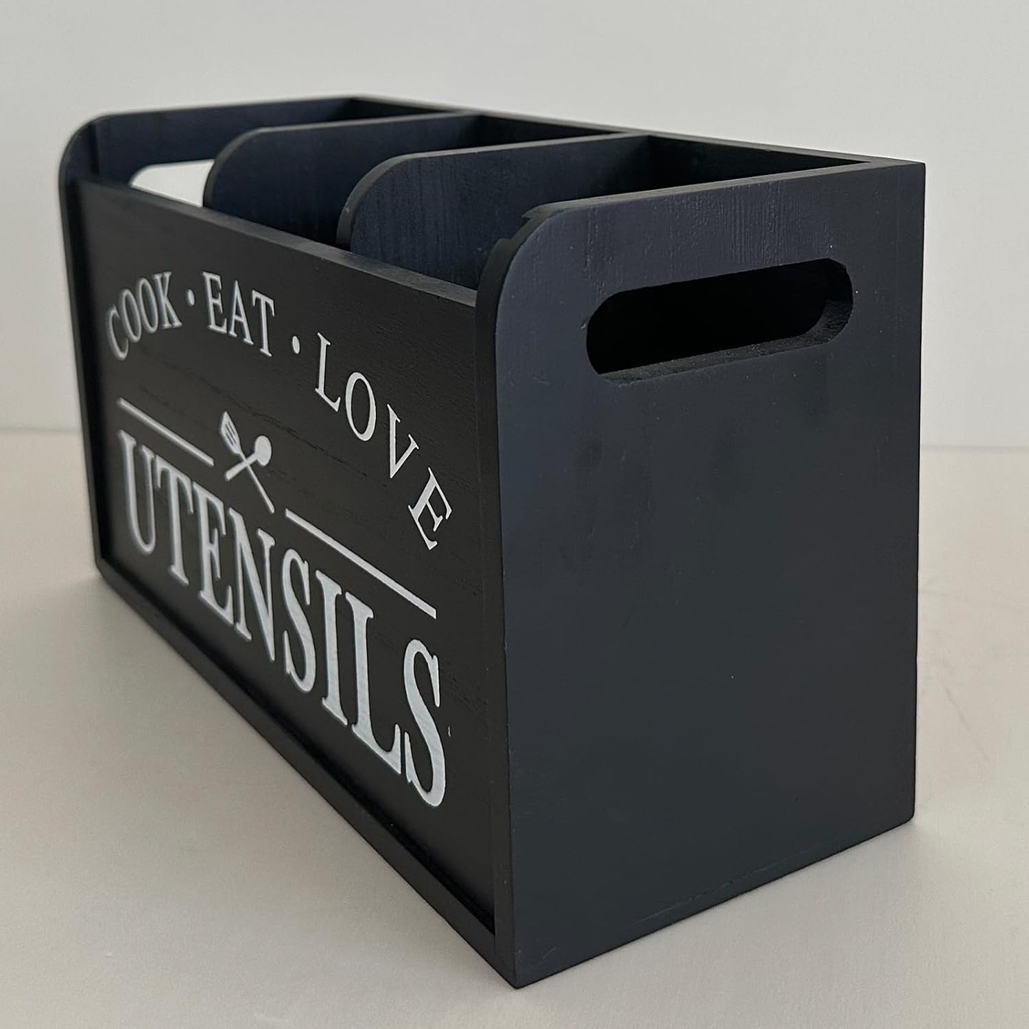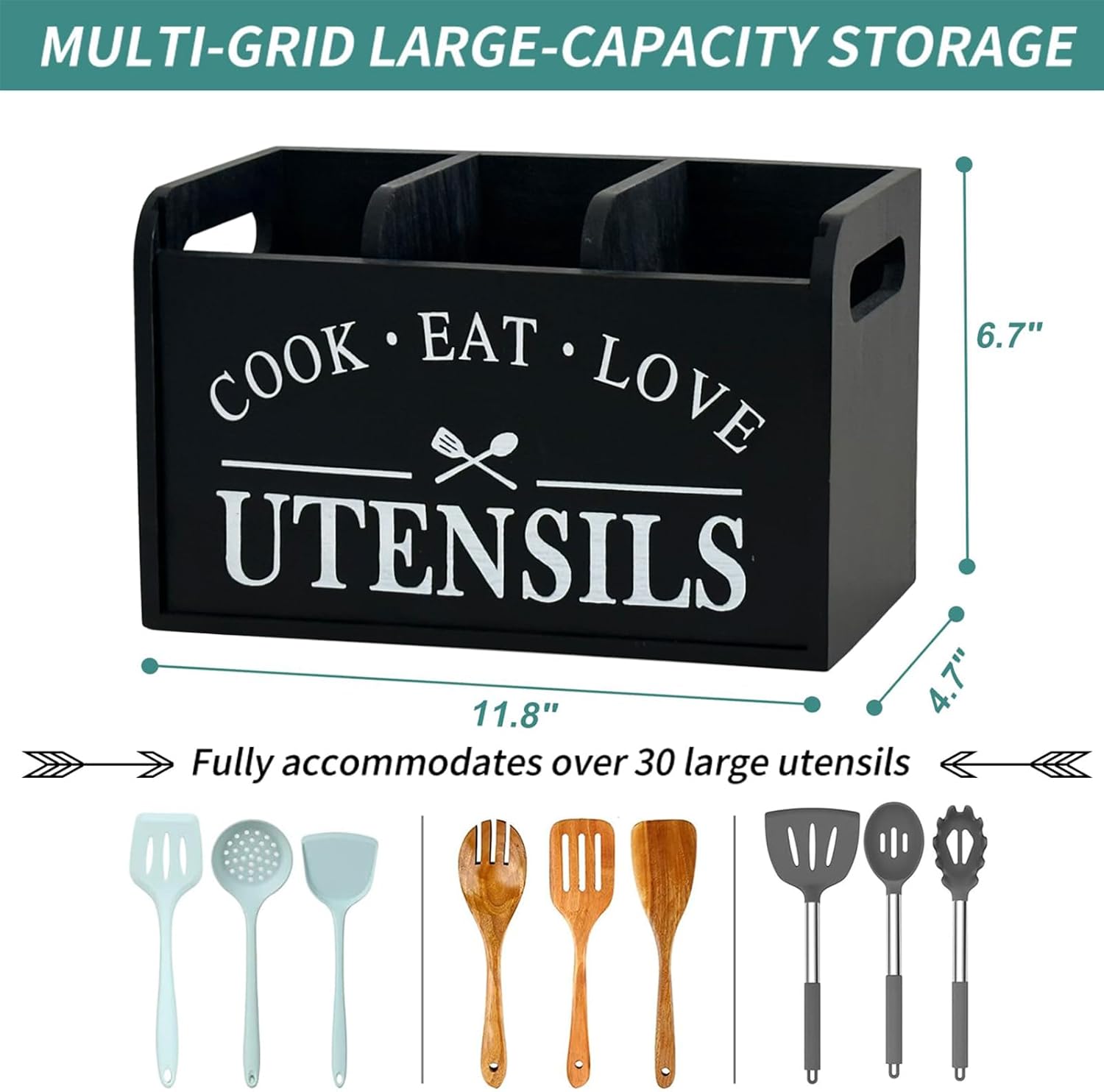 Solid Wood Farmhouse Cooking Utensils Organizer: Large Countertop Utensil Holder, 3 Compartments - Black