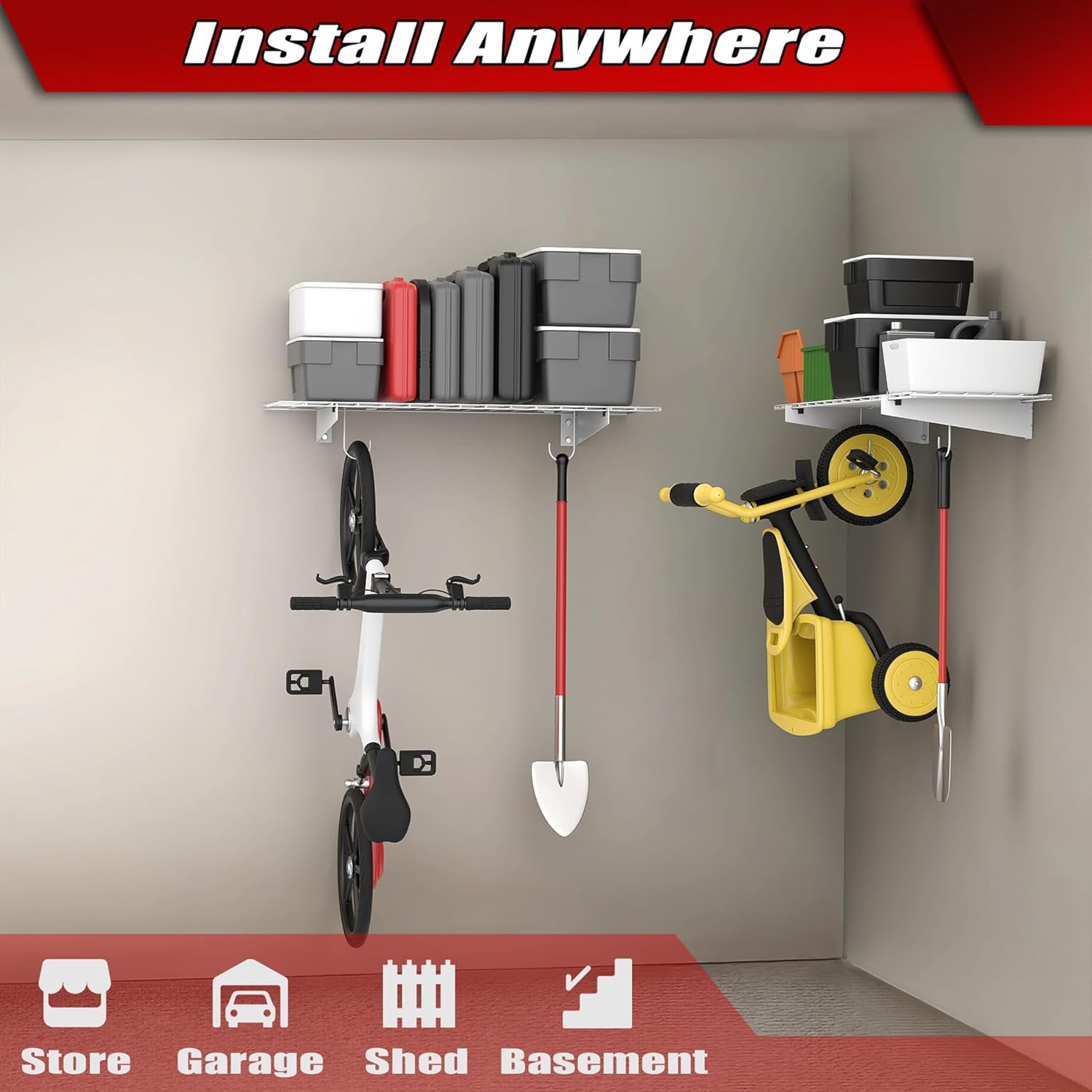 - Well Constructed: Garage wall mount shelving is made of high quality steel with powder coated finish and well constructed. Holds up to 220lbs/shelf.