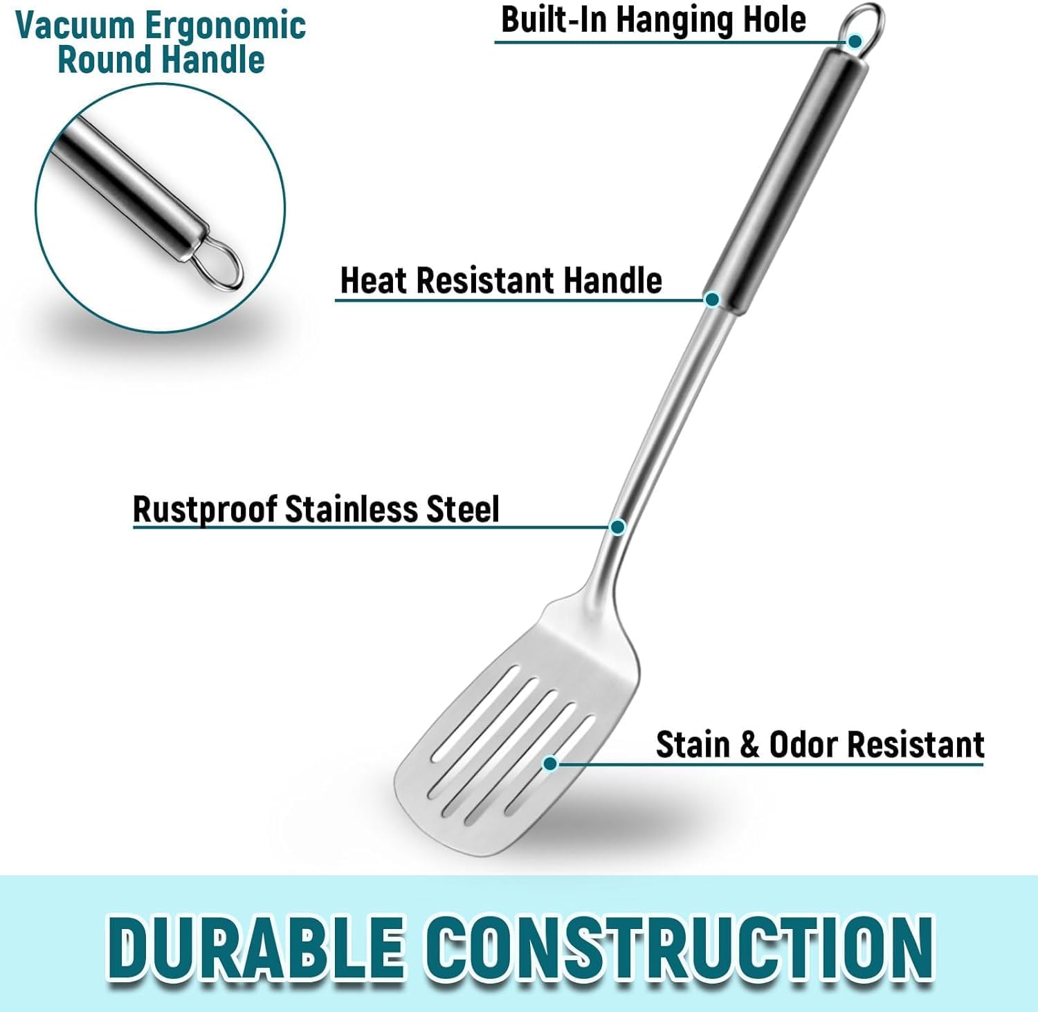- 【304 Stainless Steel Material & Exquisite Craftsmanship】 The spatula is made of 304 stainless steel, which is heat-resistant, sturdy, anti-corrosion and rust resistance that provide you with long-term use. In addition, our stainless steel spatula is manufactured through several processes, finely crafted to make the edges and surfaces smooth. Using the spatula to turn food will not ruin the original shape of the food or scratch your pan