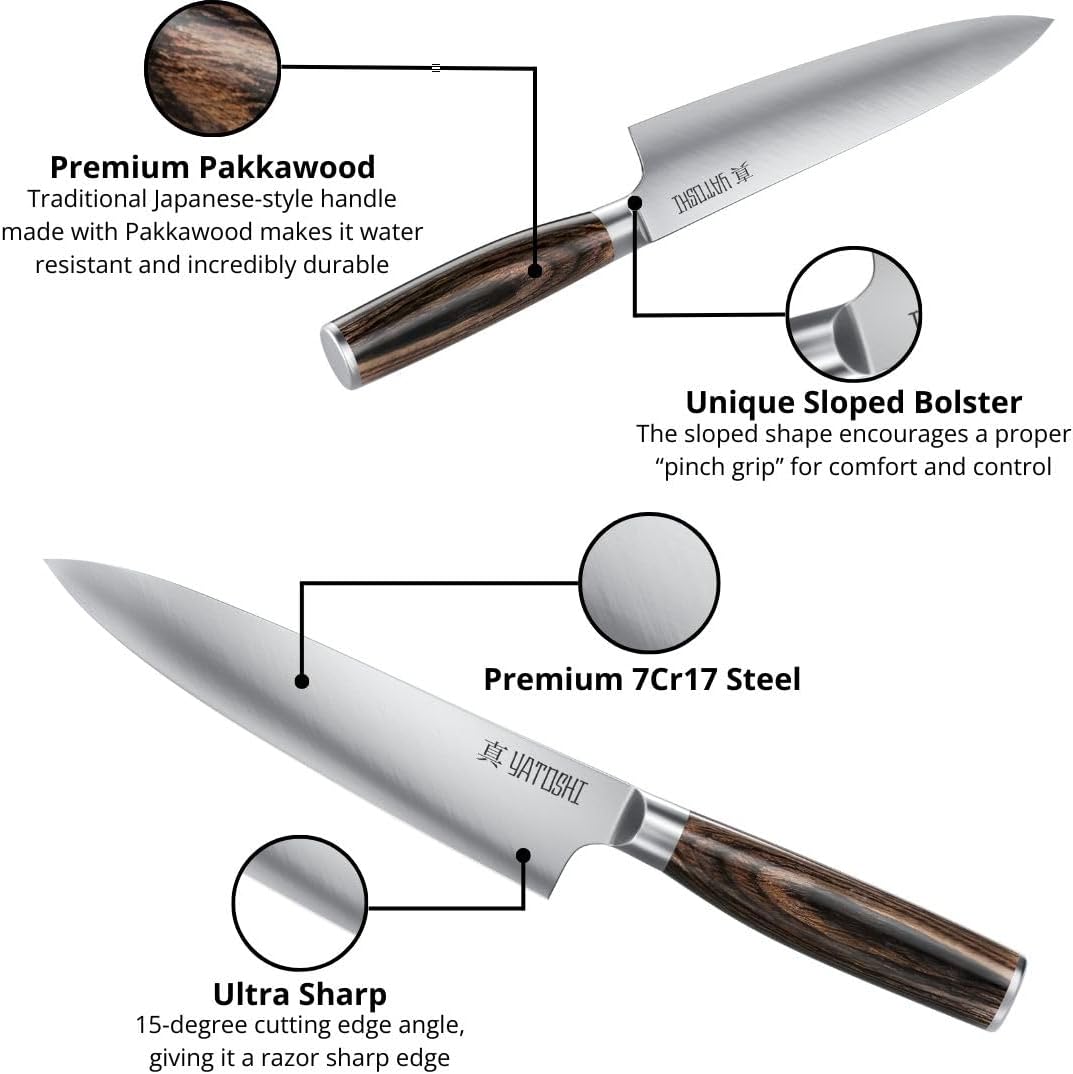 - High Carbon Blades: Made with premium 7Cr17 High Carbon Steel that provides a razor-sharp professional quality blade. The steel contains 0.6-0.75 carbon, making it two times tougher than other knives in its class with a Rockwell Hardness of 57-58.