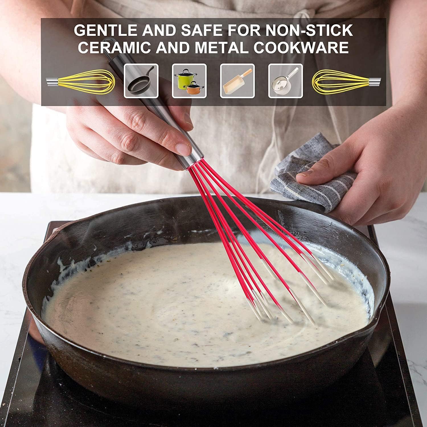 - 484ยบF High Heat-Resistant: Feature BPA free silicone wires. 2.1mm thickened wires coated with 0.3mm soft silicone makes it stronger and more durable. Great for stirring sauces and gravies while heating.