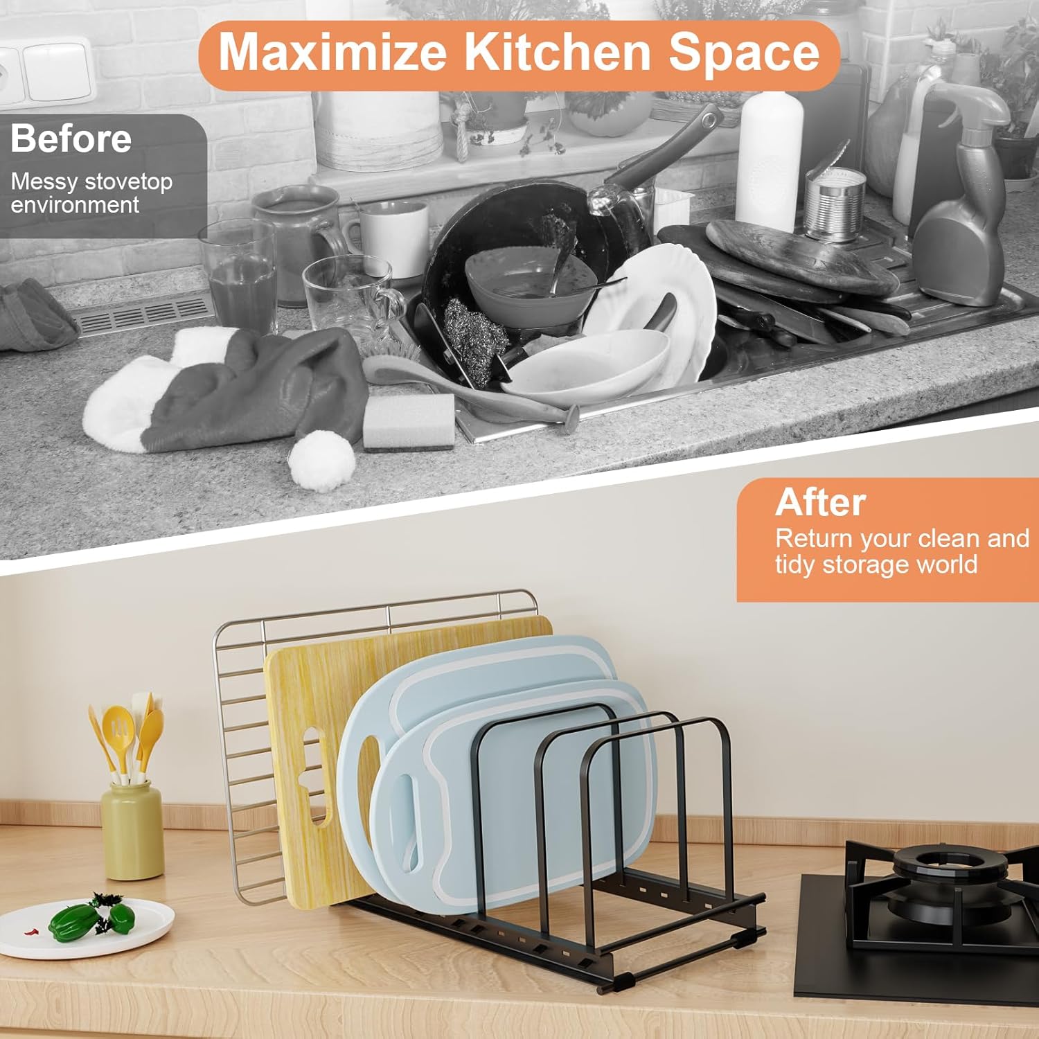 - PREMIUM MATERIAL --- TEAMOLA adjustable wide cutting board organizer is made of high quality iron wire , which is more sturdy and stable , clean and hygienic than other cutting board holder . The pot and pan rack storage for pantry organizers and storage is finished with a solid coating for a stylish look in your kitchen storage . The metal cutting board organizer for cabinet round edge design helps protect against scratches.