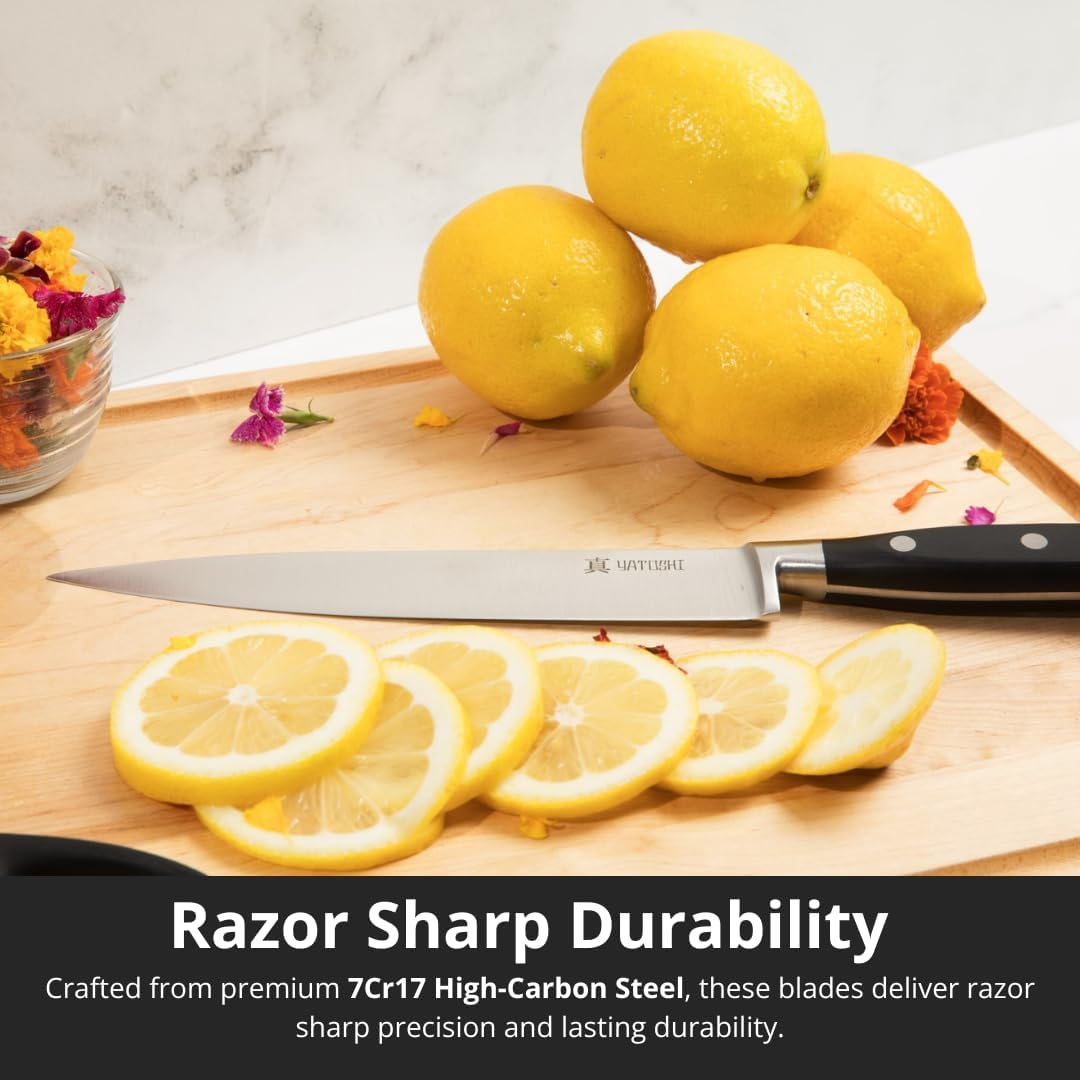 - High Carbon Blades: Made with premium 7Cr17 High Carbon Steel, which provides a razor-sharp, professional-quality blade. The steel contains 0.6-0.75 carbon, making it two times tougher than other knives in its class with a Rockwell Hardness of 57-58.