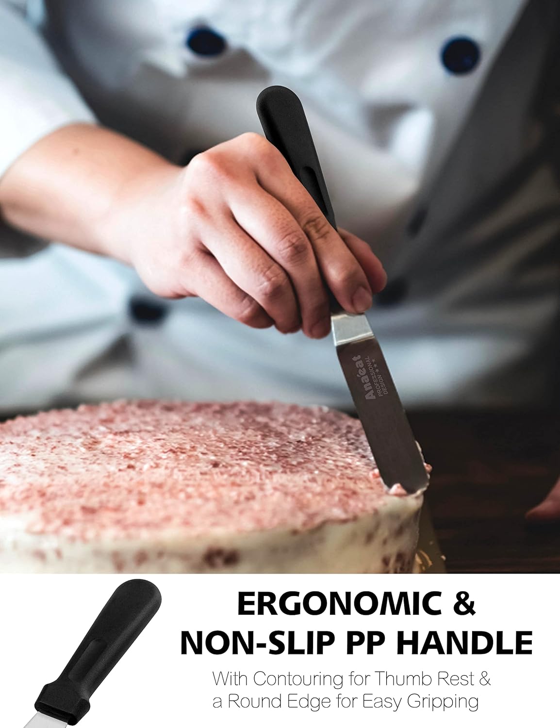 - PERFECT BALANCE BETWEEN STIFFNESS & FLEXIBILITY: Anaeat Spatula gives you more control when icing your cake. The Professional Angled cake spatula is good to move easier when frosting cake. Great for frosting and smoothing icing on cakes to keep your hands and finger away from the icing.