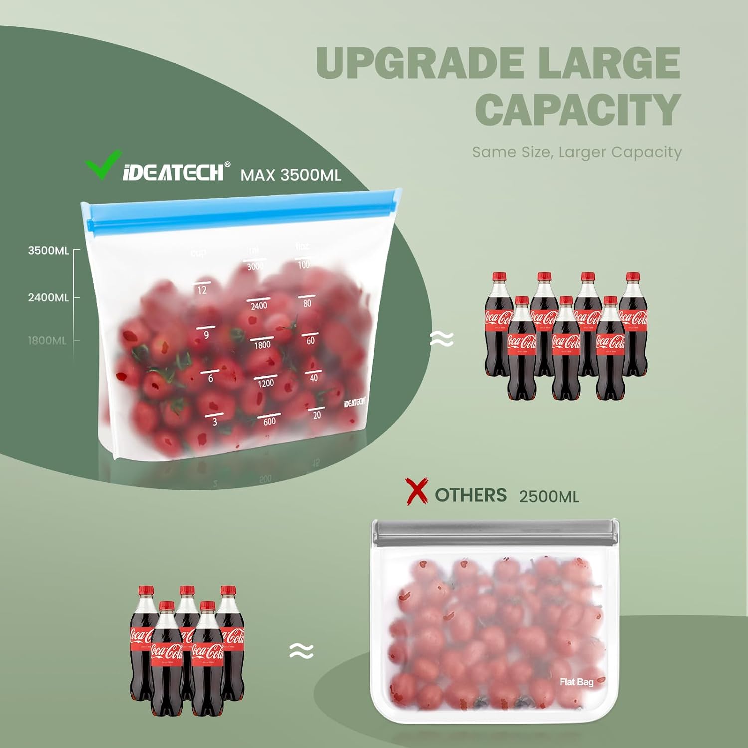 - Reusable and Recyclable: These food bags are designed with environmental issues in mind, so we use extra-thick, ultra-wear-resistant PEVA material that can be reused hundreds of times, and one reusable silicone bag can replace more than 400 plastic bag