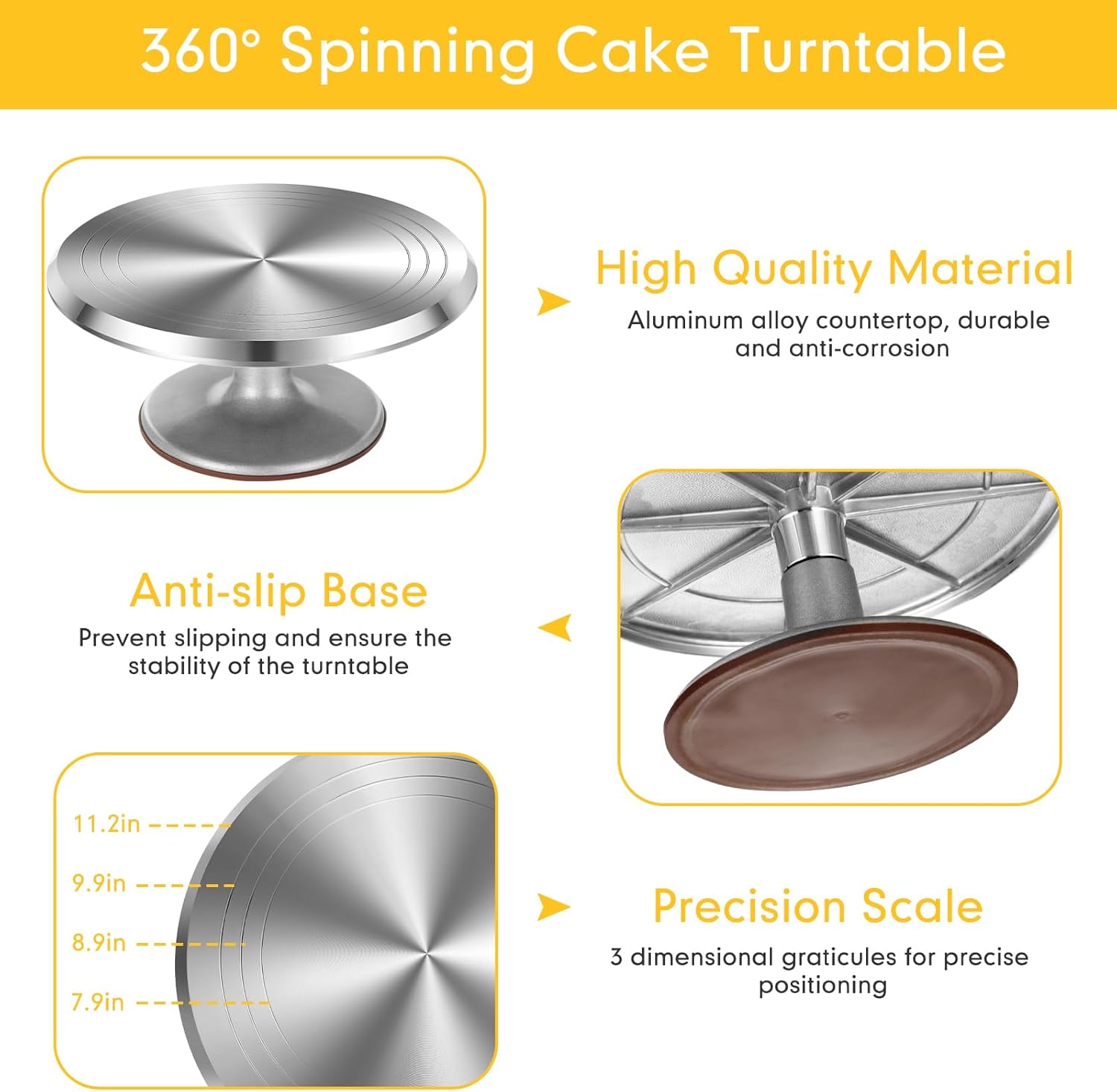 - 360° Rotating Cake Turntable: the 12 inch diameter cake decorating turntable is made of quality aluminum alloy, ensuring durability and smooth rotation on concealed ball bearings; This feature allows for easy and precise cake decorating from most angles, making the process efficient and enjoyable